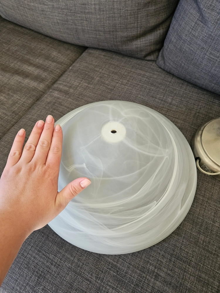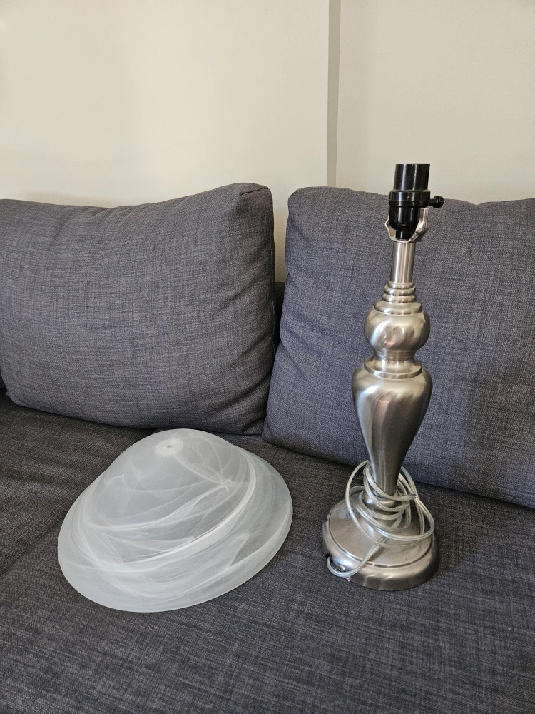 Beautiful table lamp features a brushed nickel finish. And alabaster glass shade. Not sure if two can go together but worth a try, i guess! Simple design, perfect for bedside or living room. Pre-owned, some minor wear. Could be good for a craft project