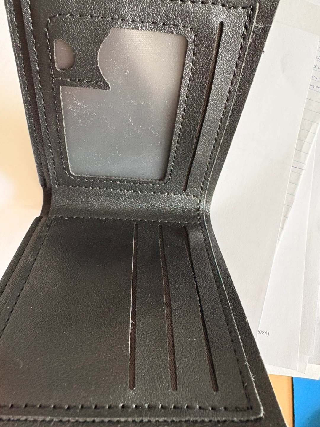 JIANGBAO bifold wallet in black. It has multiple card slots and a clear ID window. Leather-like material.