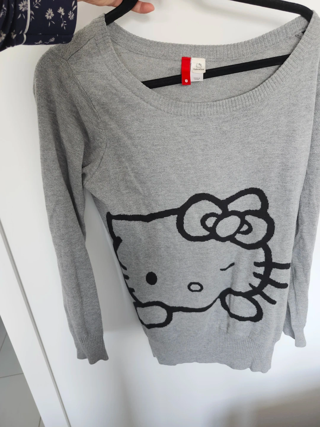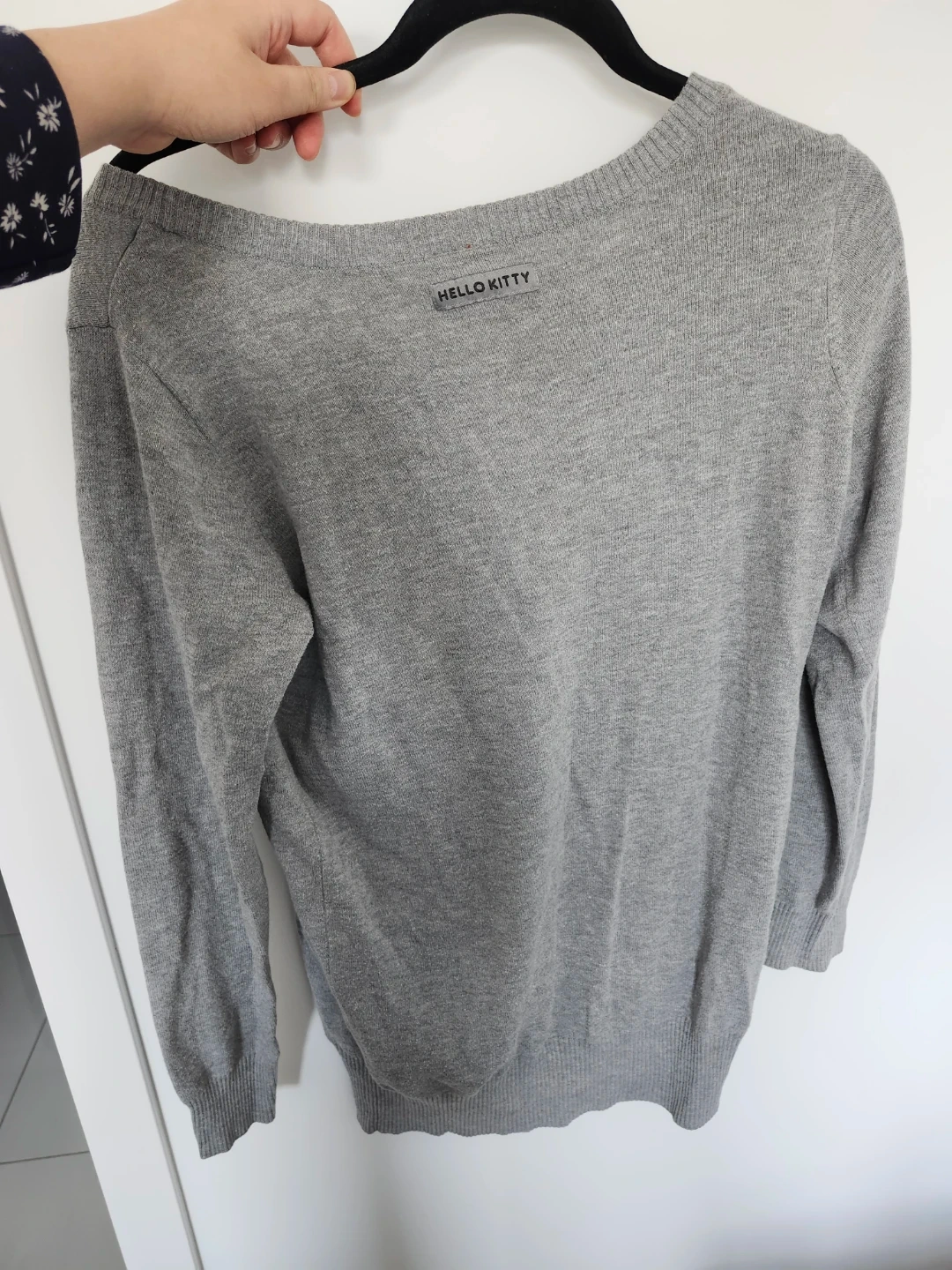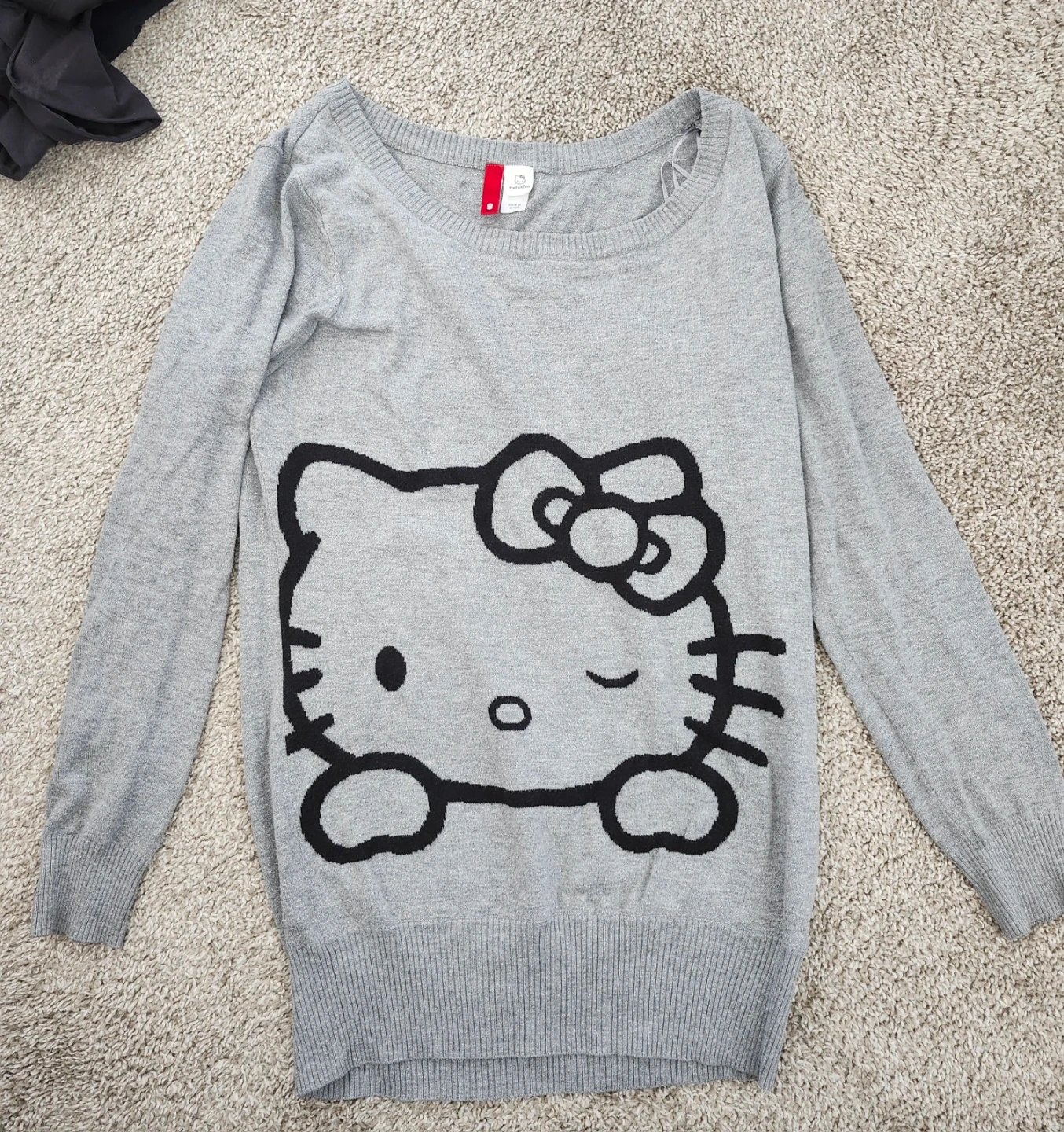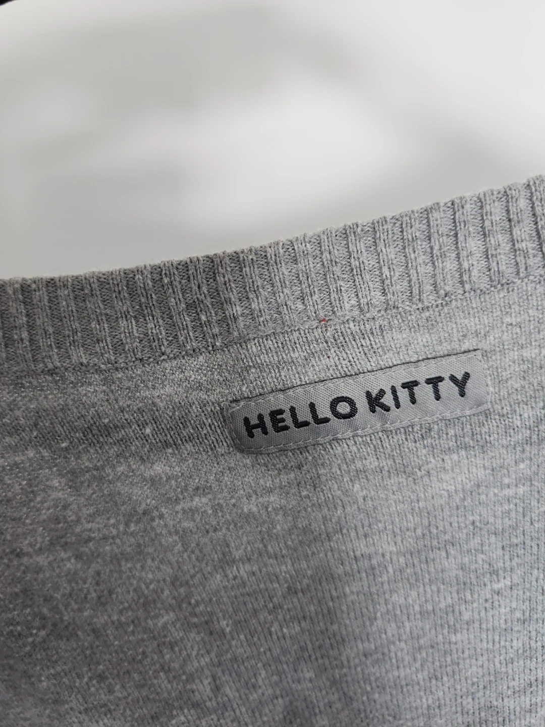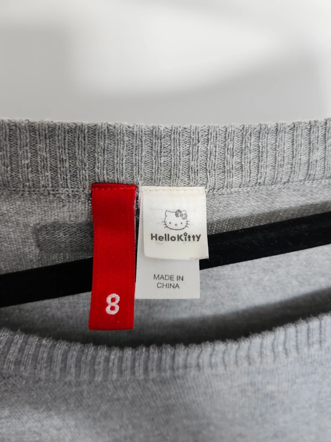 Grey long-sleeved sweater featuring a large black Hello Kitty graphic. It's a size 8. Perfect for fans of Hello Kitty!
