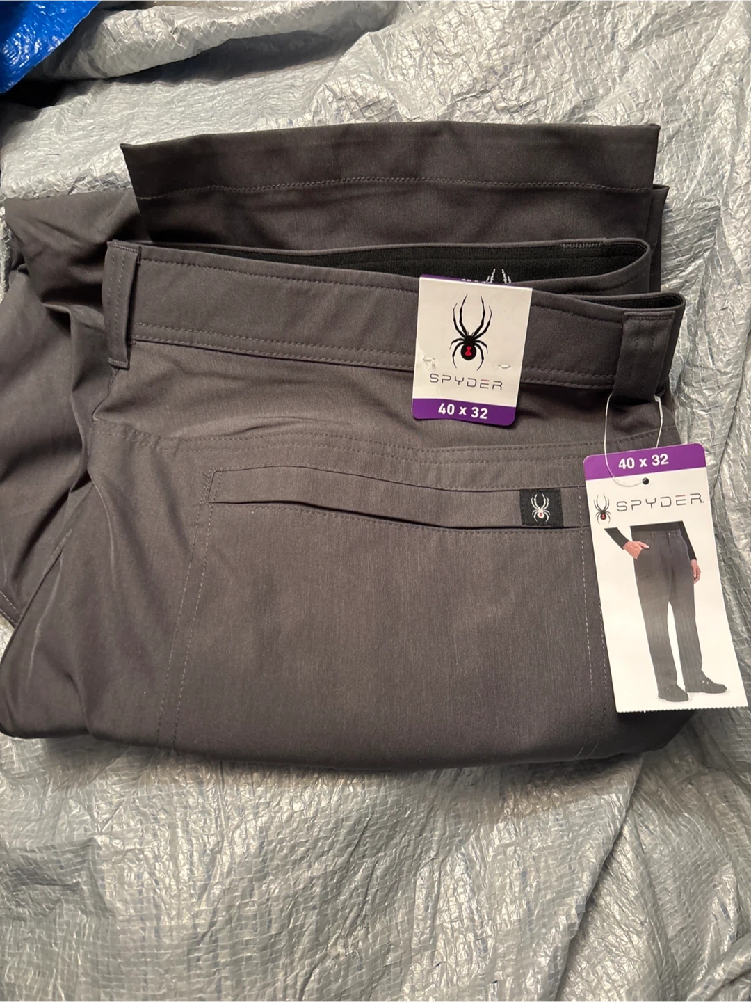 Spyder men's pants in a dark grey colour. Size 40 waist by 32 inseam. These pants feature a zippered pocket on the right leg. They're made with a durable fabric perfect for outdoor activities.