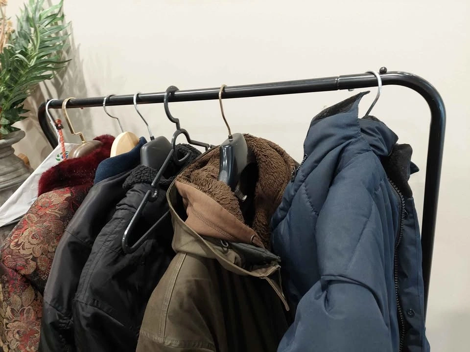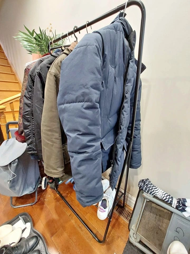 A black metal framed coat/garment rack with a bottom shelf for shoes or handbags, etc! Very lightweight and easy to move around the house if needed! No hangers included. We used it for our jackets and shoes so a light wipe might be needed if using for indoor garments.