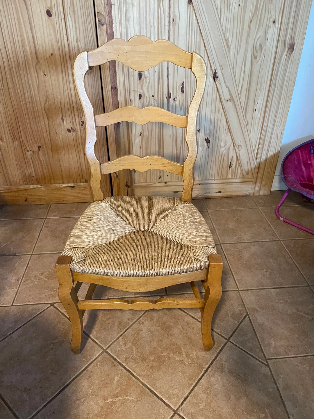 Solid table and Chairs. Table could use refinishing as a couple heat spot. 42" x 89.5" with 2x 12" removable leaf inserts. The chairs are French Country style with woven seat. Nice rustic country charm adds warmth to any space.