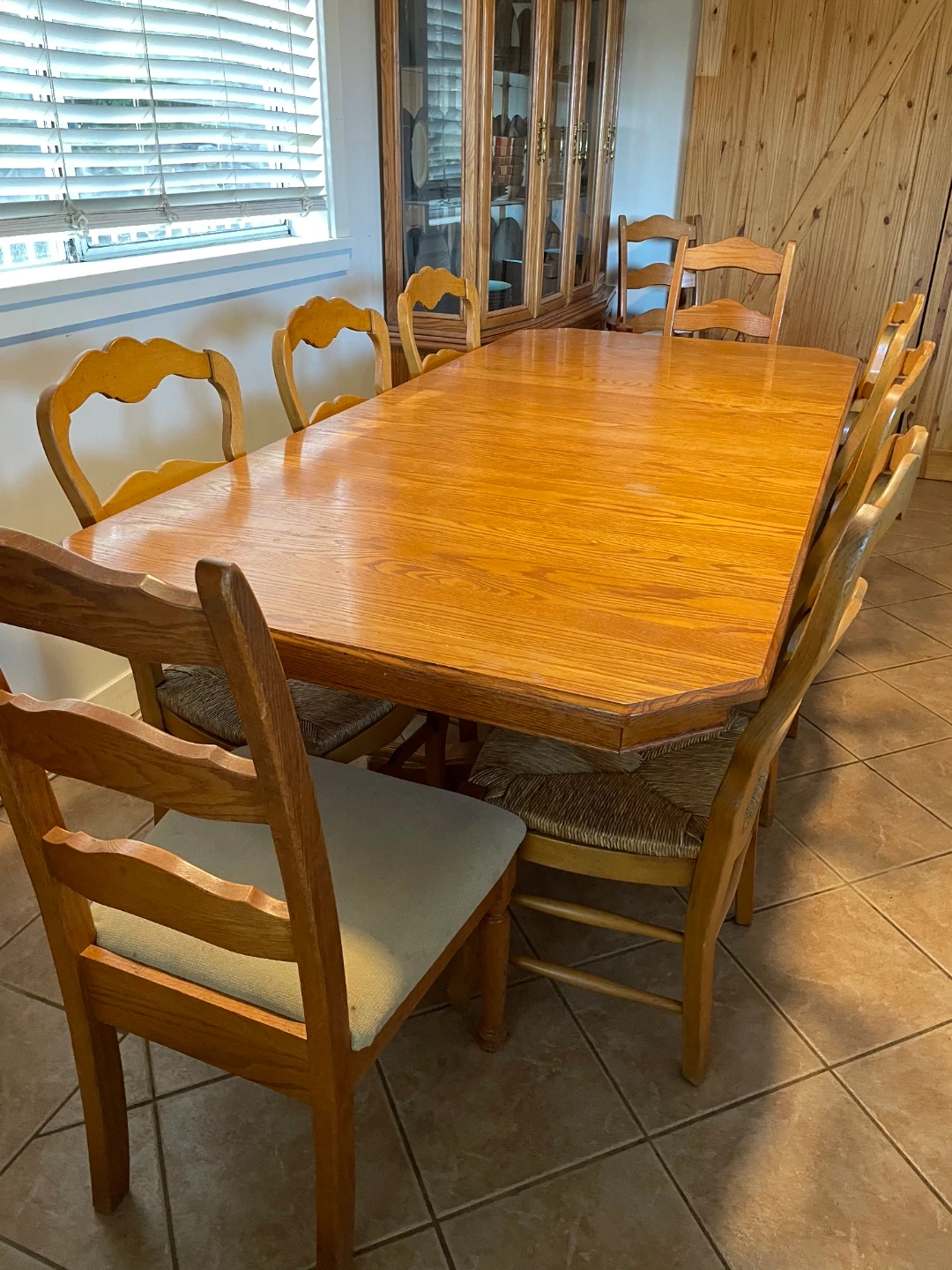 Solid table and Chairs. Table could use refinishing as a couple heat spot. 42" x 89.5" with 2x 12" removable leaf inserts. The chairs are French Country style with woven seat. Nice rustic country charm adds warmth to any space.