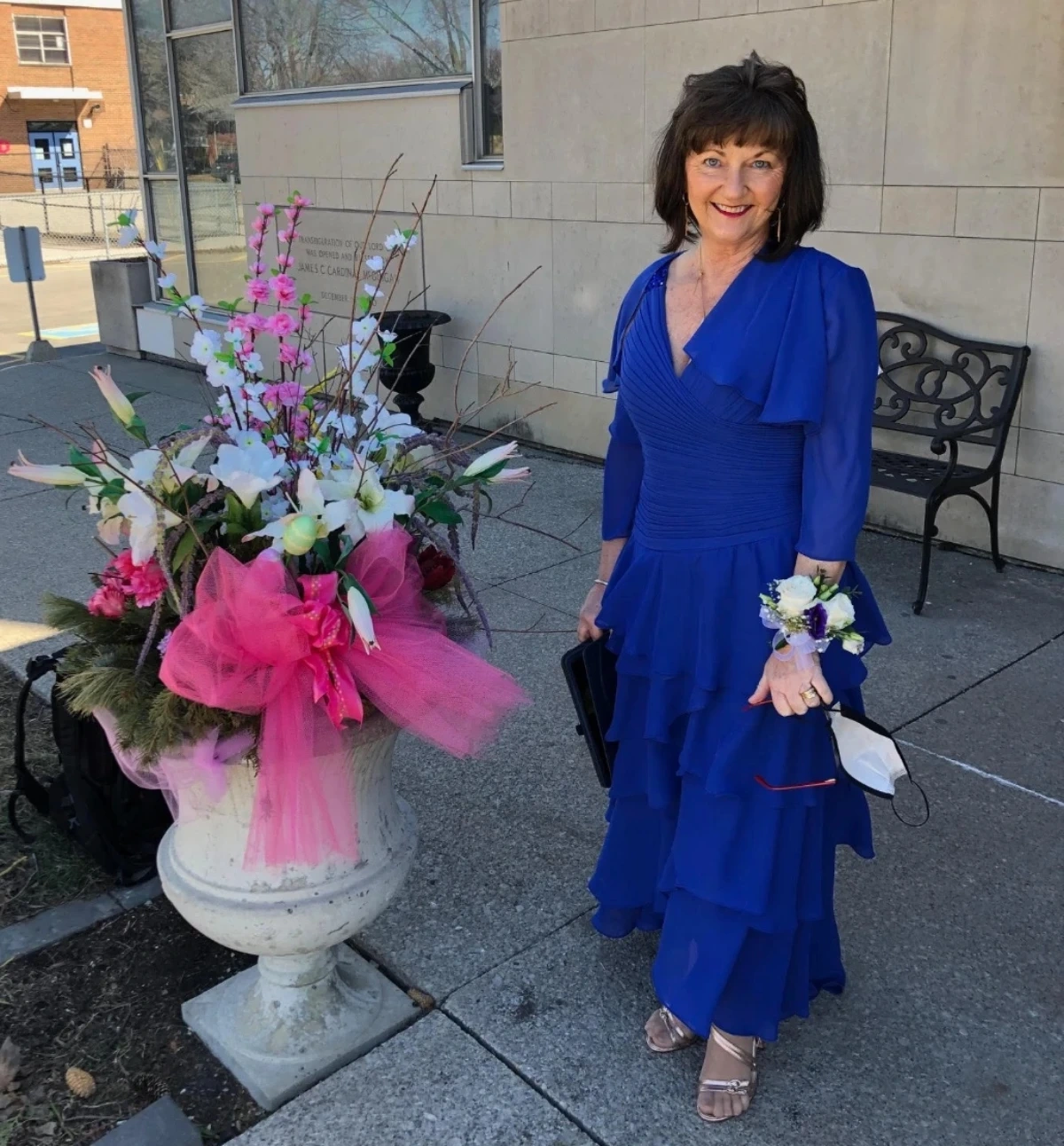 Elegant blue chiffon dress with tiered ruffles and a matching bolero jacket. Features a flattering V-neckline and a tiered, flowing skirt. Perfect for formal events or special occasions! Wore it for only 2 hours. I bought the dress $235. The bolero was $35