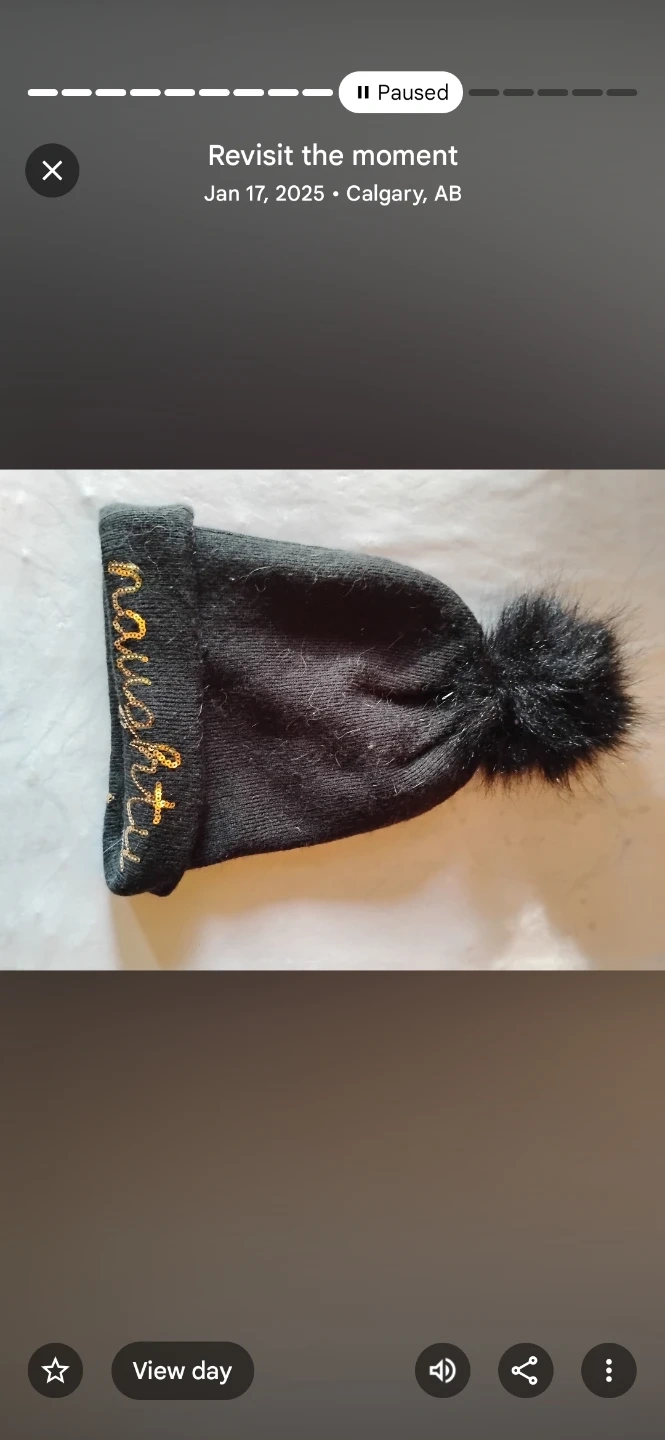 This black knit beanie features gold sequin embroidery spelling "naughty" on the cuff. It's topped with a fluffy black pom pom. It's a fun accessory for cooler weather!