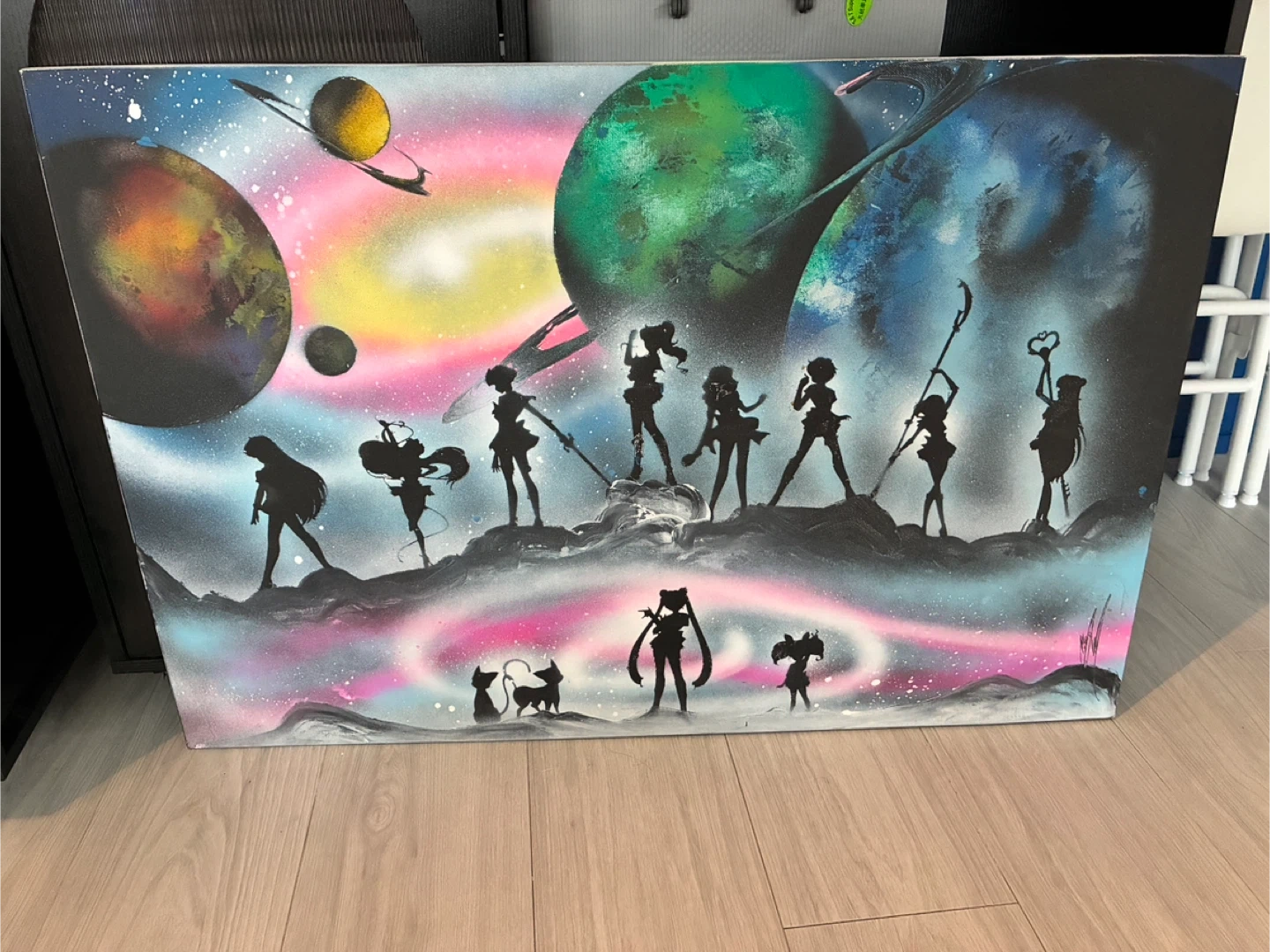Original spray paint art piece featuring silhouettes of the Sailor Moon characters and their cats against a vibrant galaxy backdrop. Created with spray paint on canvas.