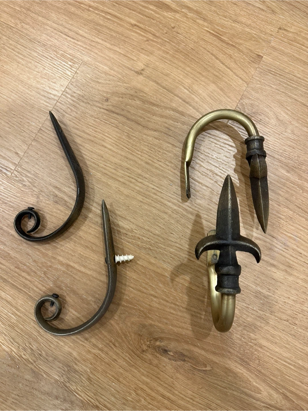 These are decorative curtain holdbacks. They're made of metal and come in a dark bronze finish. Two have a scroll design, and two have a more ornate, pointed end with a mounting plate. Hardware included for two. $5 per set. Or $10 for 2 sets.