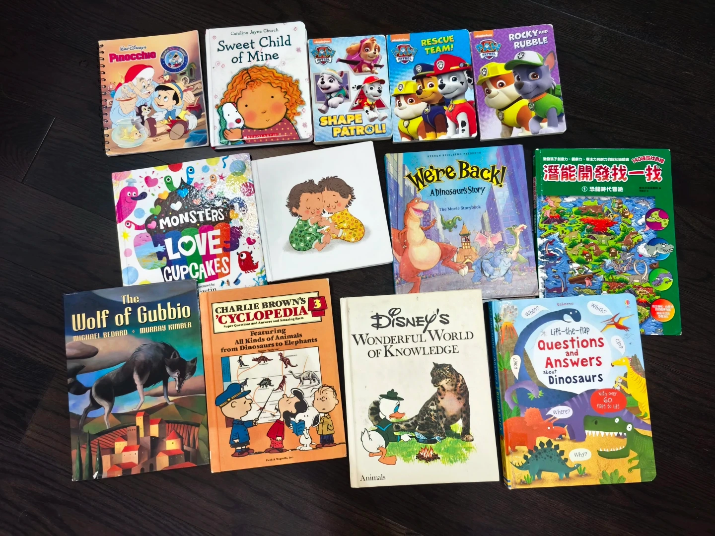 A collection of children's books including Pinocchio, Sweet Child of Mine, Paw Patrol stories, Monsters Love Cupcakes, and dinosaur-themed books. There are also books from Charlie Brown's Cyclopedia and Disney's Wonderful World of Knowledge. Features lift-the-flap elements in one of the dinosaur books.