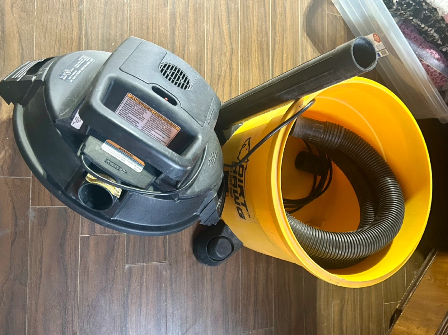I am selling a Dirt Hawg 12-gallon wet-dry vacuum with a 5.0 peak HP motor, perfect for cleaning up messes in your home or garage. This vacuum has been used and shows signs of wear, but it is still in good working condition and ready to tackle any cleaning job.
