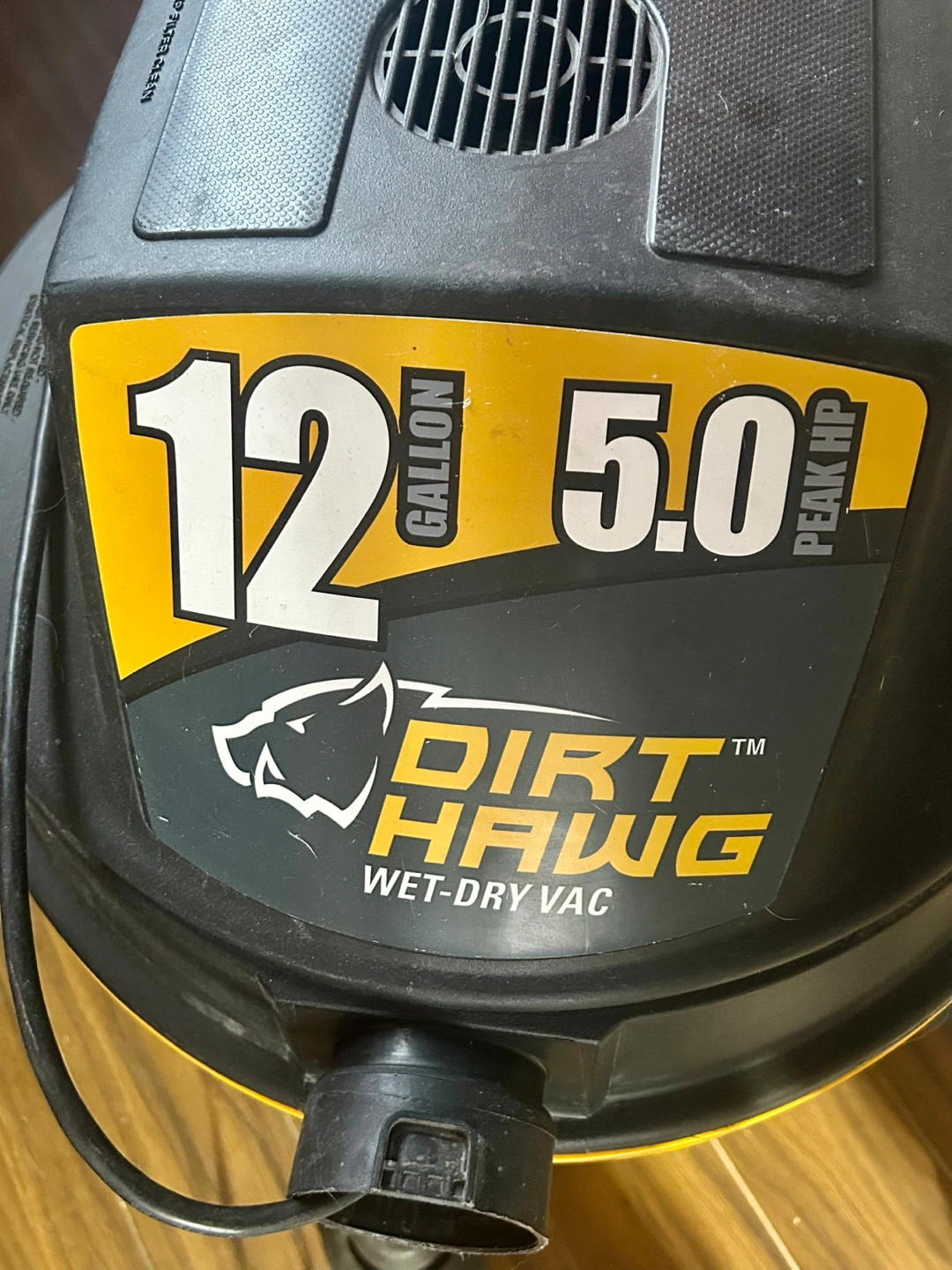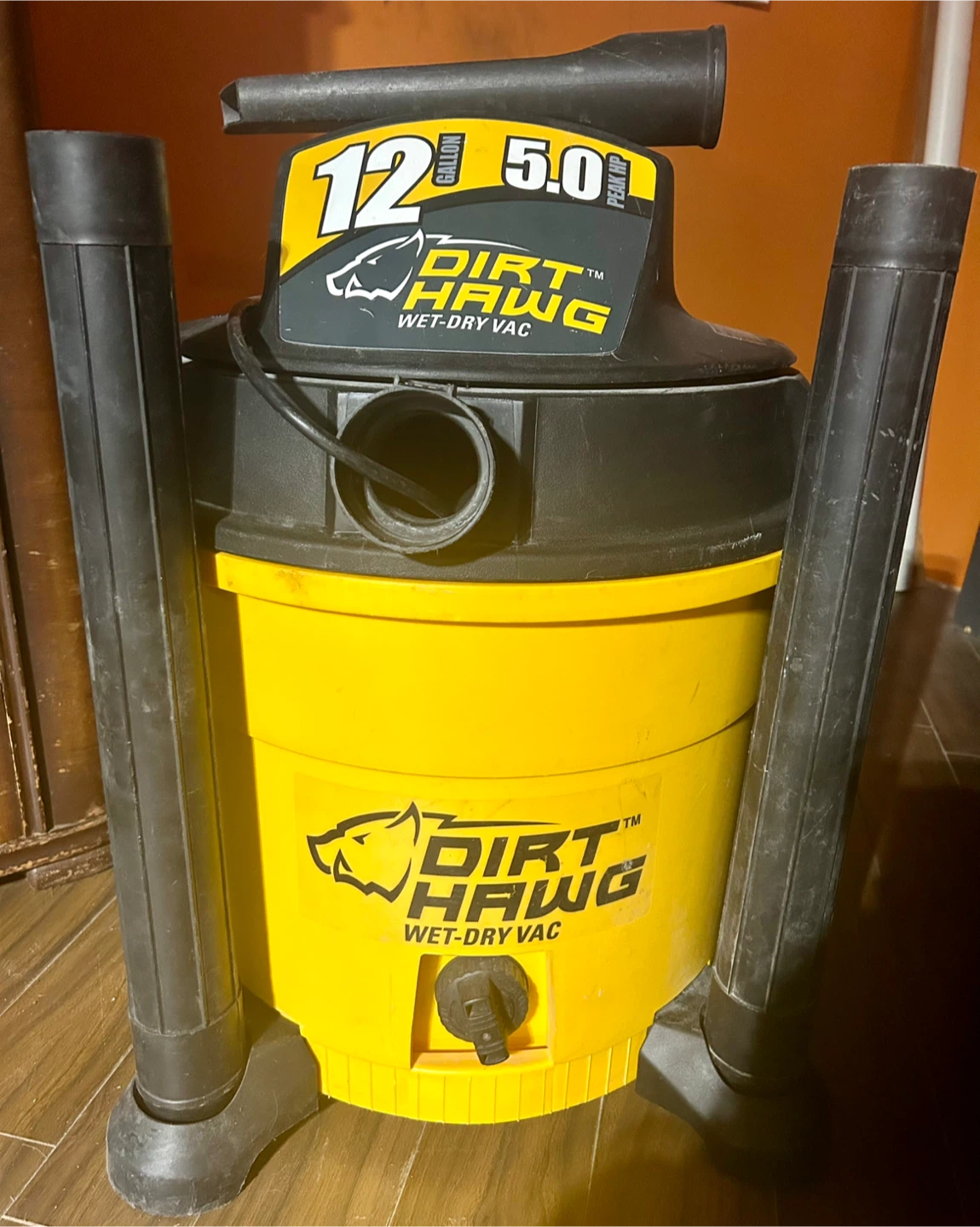 I am selling a Dirt Hawg 12-gallon wet-dry vacuum with a 5.0 peak HP motor, perfect for cleaning up messes in your home or garage. This vacuum has been used and shows signs of wear, but it is still in good working condition and ready to tackle any cleaning job.