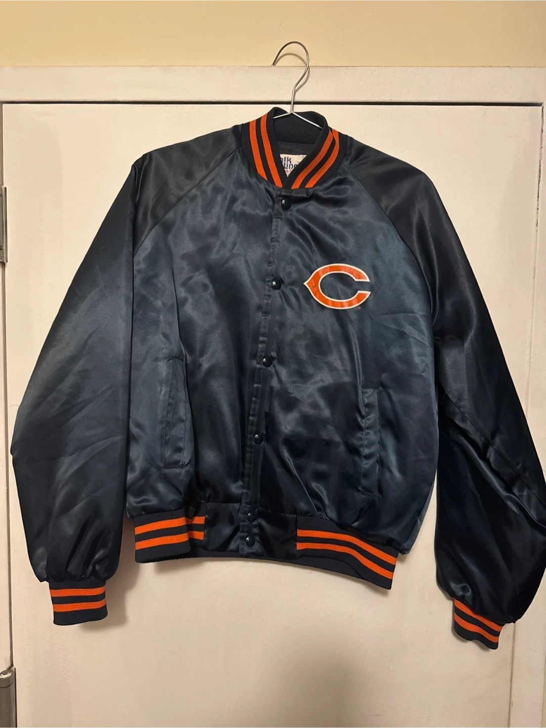 Chalk Line satin bomber jacket featuring the Chicago Bears logo on the front and 'BEARS' on the back. Orange and navy striped collar, cuffs, and hem. Made in the U.S.A. Size Medium.