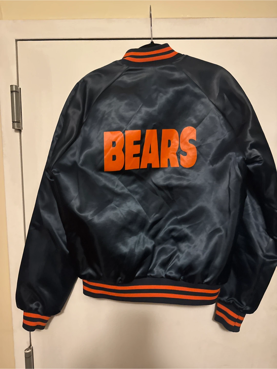 Chalk Line satin bomber jacket featuring the Chicago Bears logo on the front and 'BEARS' on the back. Orange and navy striped collar, cuffs, and hem. Made in the U.S.A. Size Medium.