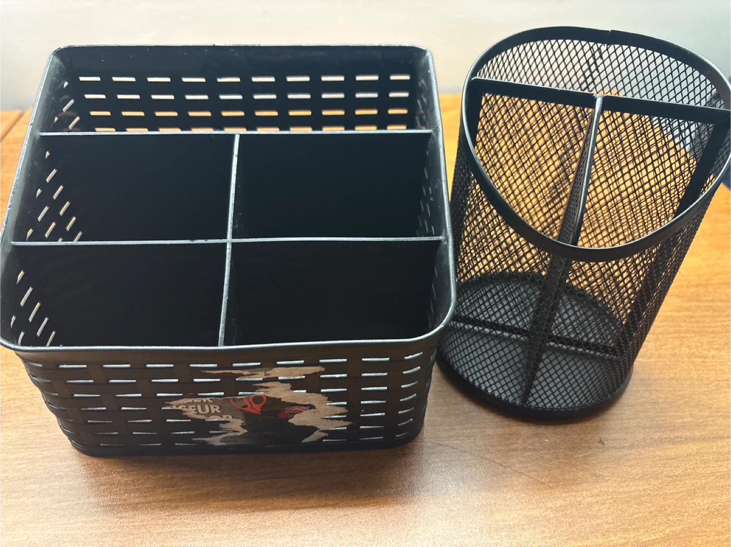 Two black desk organizers, one rectangular with four compartments and one cylindrical with three compartments. Metal construction with a perforated design.