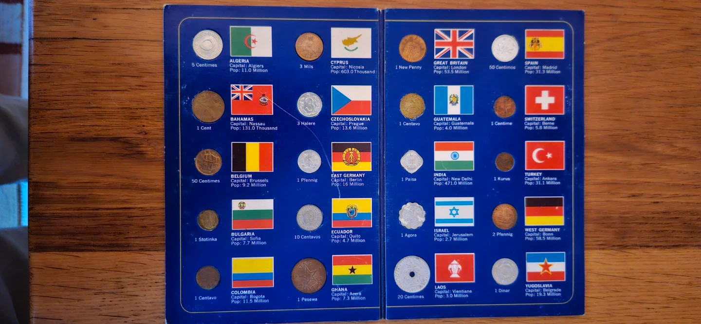 This collector album features coins from various countries. It includes examples from Algeria, Belgium, Bahamas, and more. Great for any coin enthusiast looking to expand their collection!
