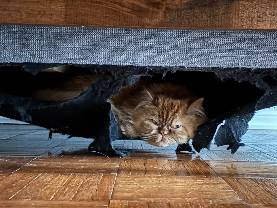 Decorative pillows included. There's a hole/cat hammock in the bottom of the couch (photo included). Selling as-is, pick-up only. Yonge/Sheppard area.