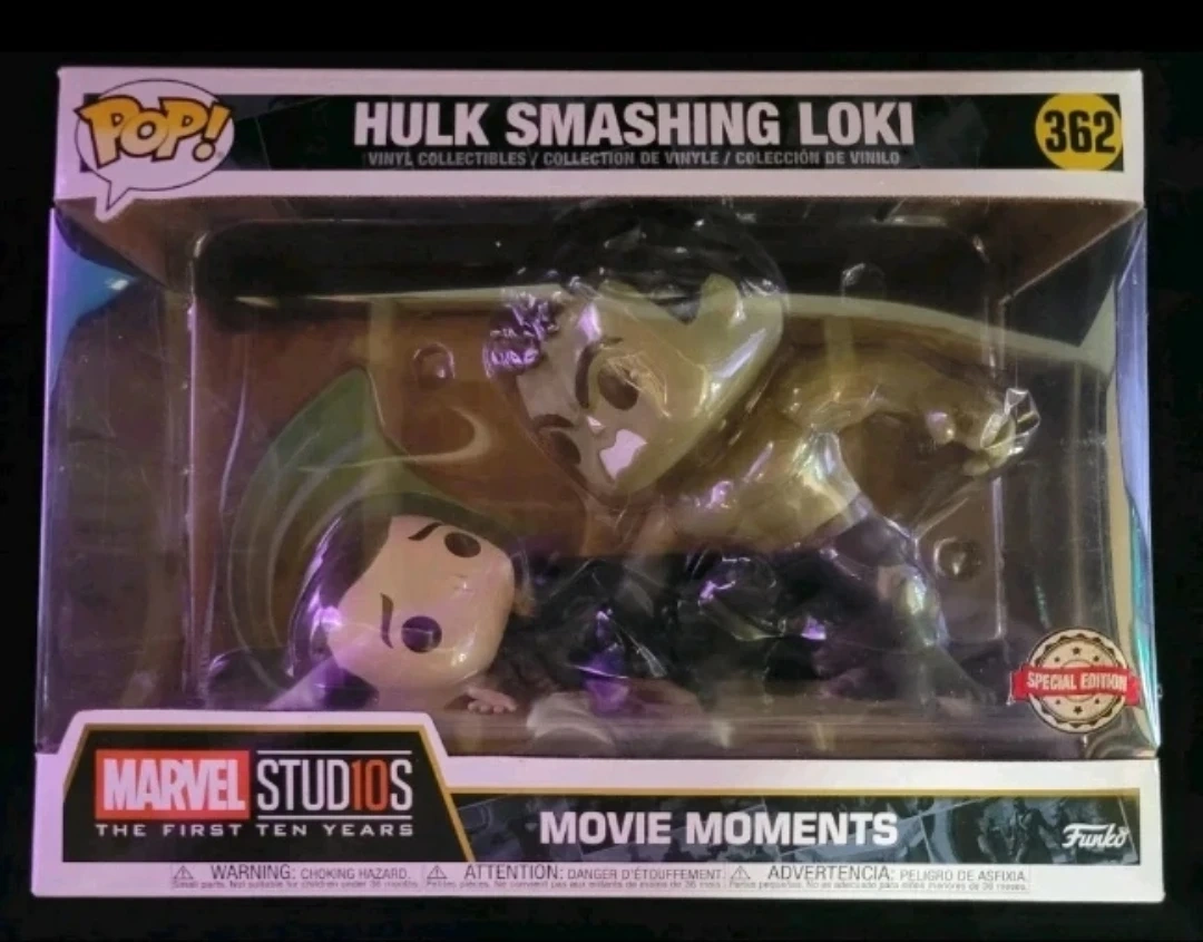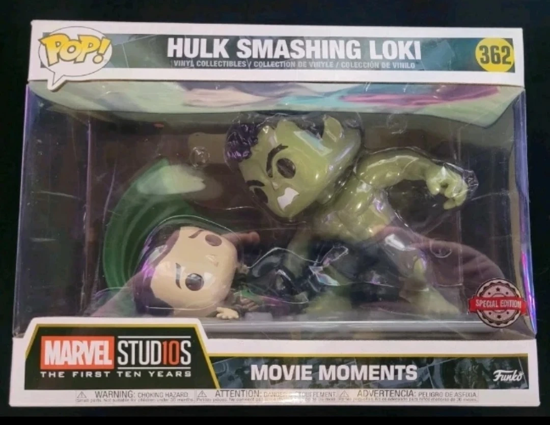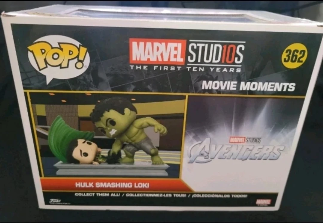 This is a Funko Pop! vinyl collectible from Marvel Studios' Avengers 'Movie Moments' series. It depicts the iconic Hulk smashing Loki scene. Includes original packaging.