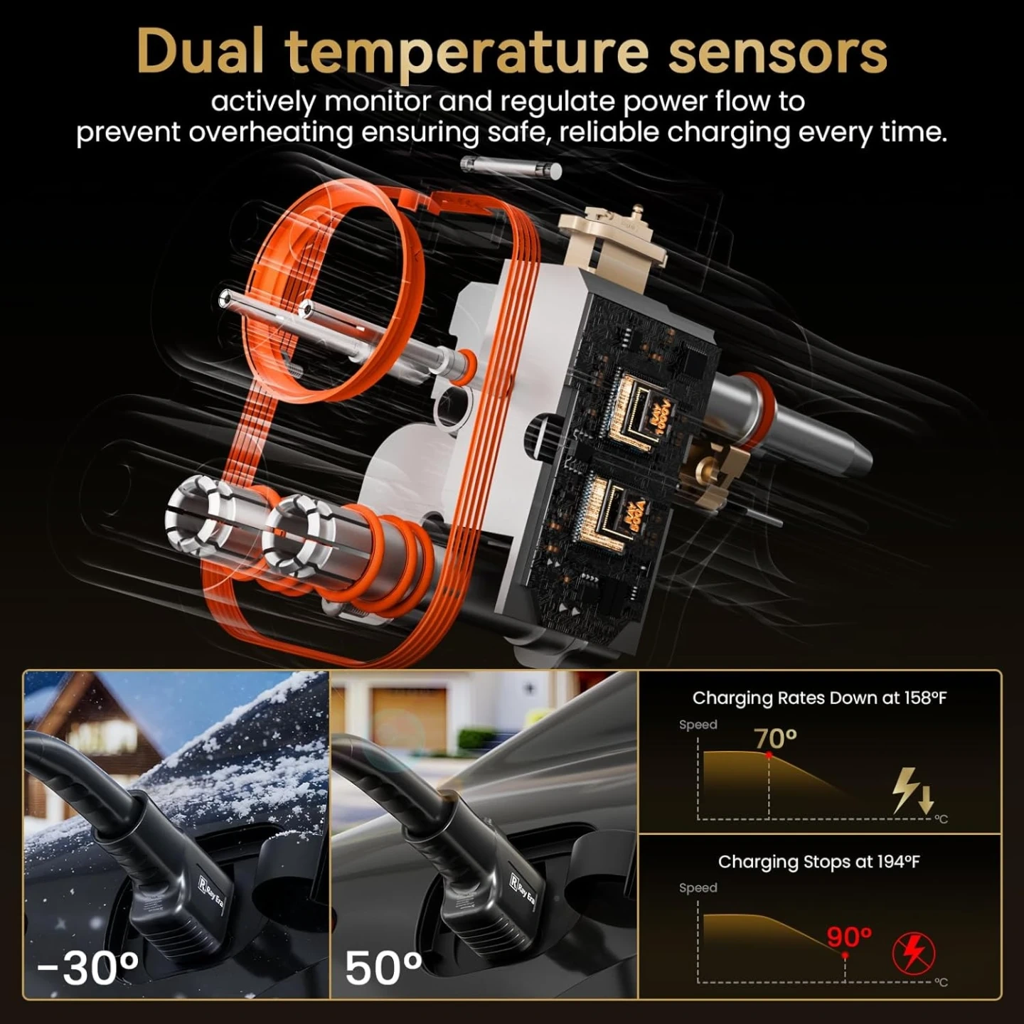 【Smart 3-Zone Temperature Control】 Equipped with intelligent triple temperature sensors that monitor the plug, cable, and internal chip in real time. Automatically adjusts power output or stops charging if overheating occurs—preventing damage and ensuring consistent, safe performance throughout every session.
