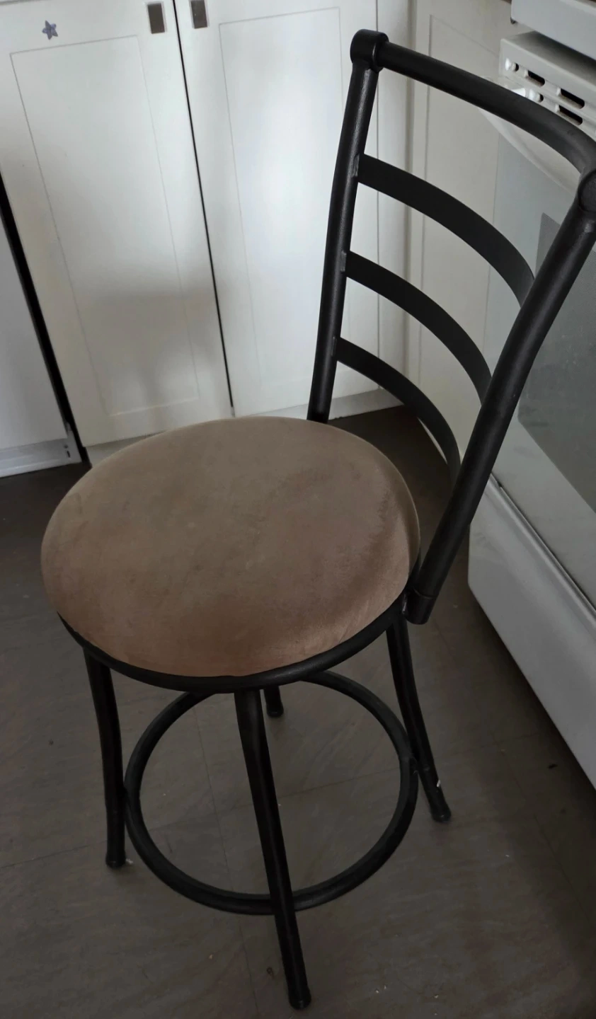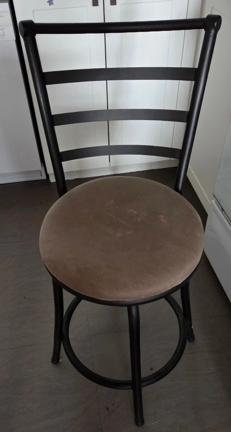 This is a swivel bar stool with a fabric seat and metal frame. It's a comfortable and stylish addition to any kitchen island or home bar. The seat swivels 360 degrees for easy access.