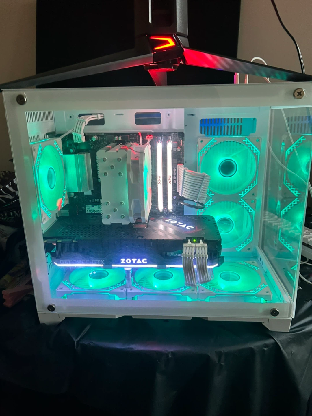 This is a ZOTAC GeForce RTX gaming desktop computer. It's built with multiple green LED fans for cooling and aesthetics. The case is white and clear acrylic.