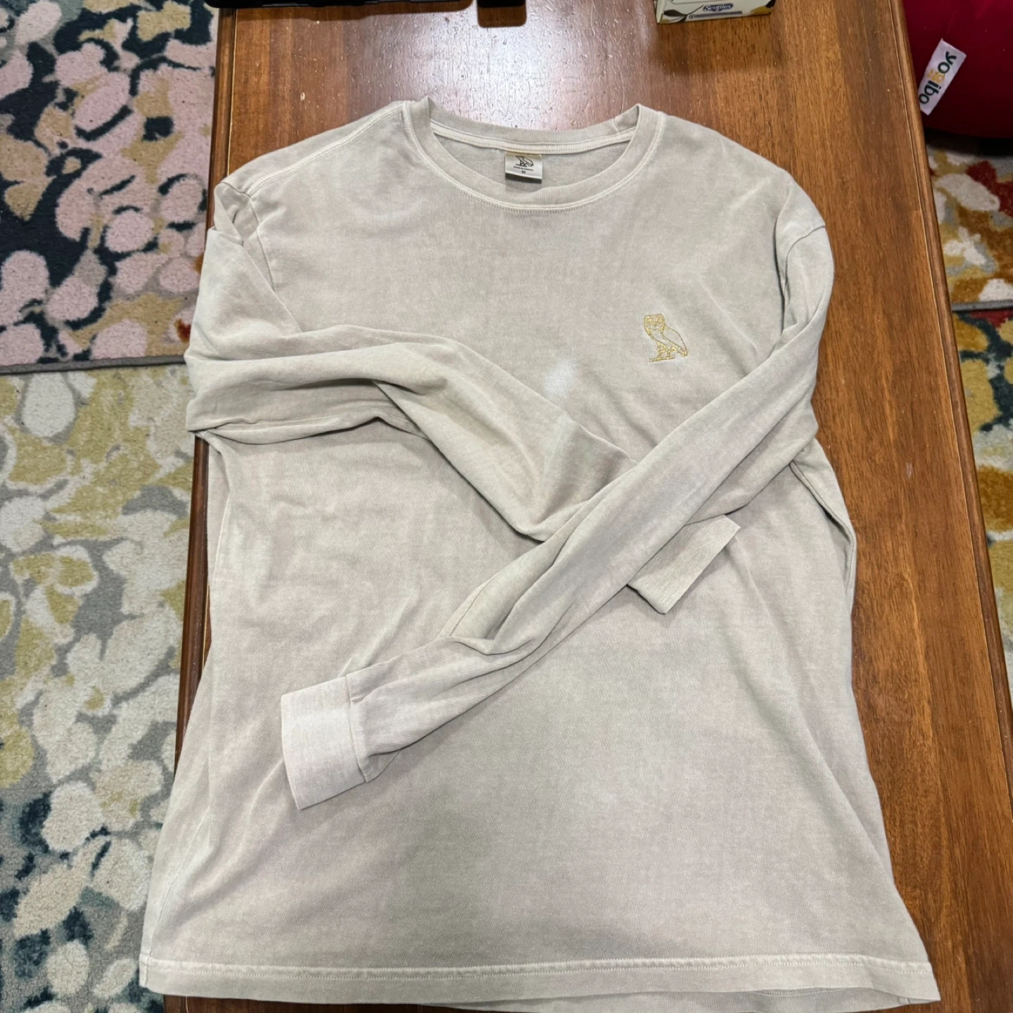 This is an October's Very Own long sleeve t-shirt. It's 100% cotton and made in Canada. The size is medium. Features the iconic OVO owl logo.