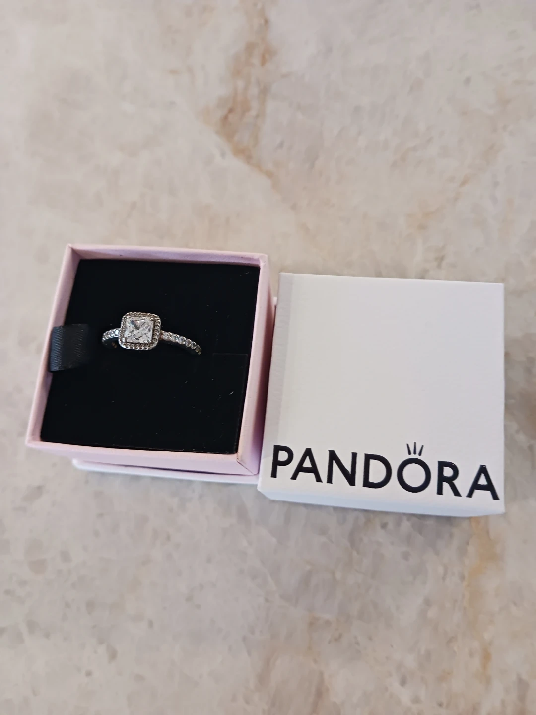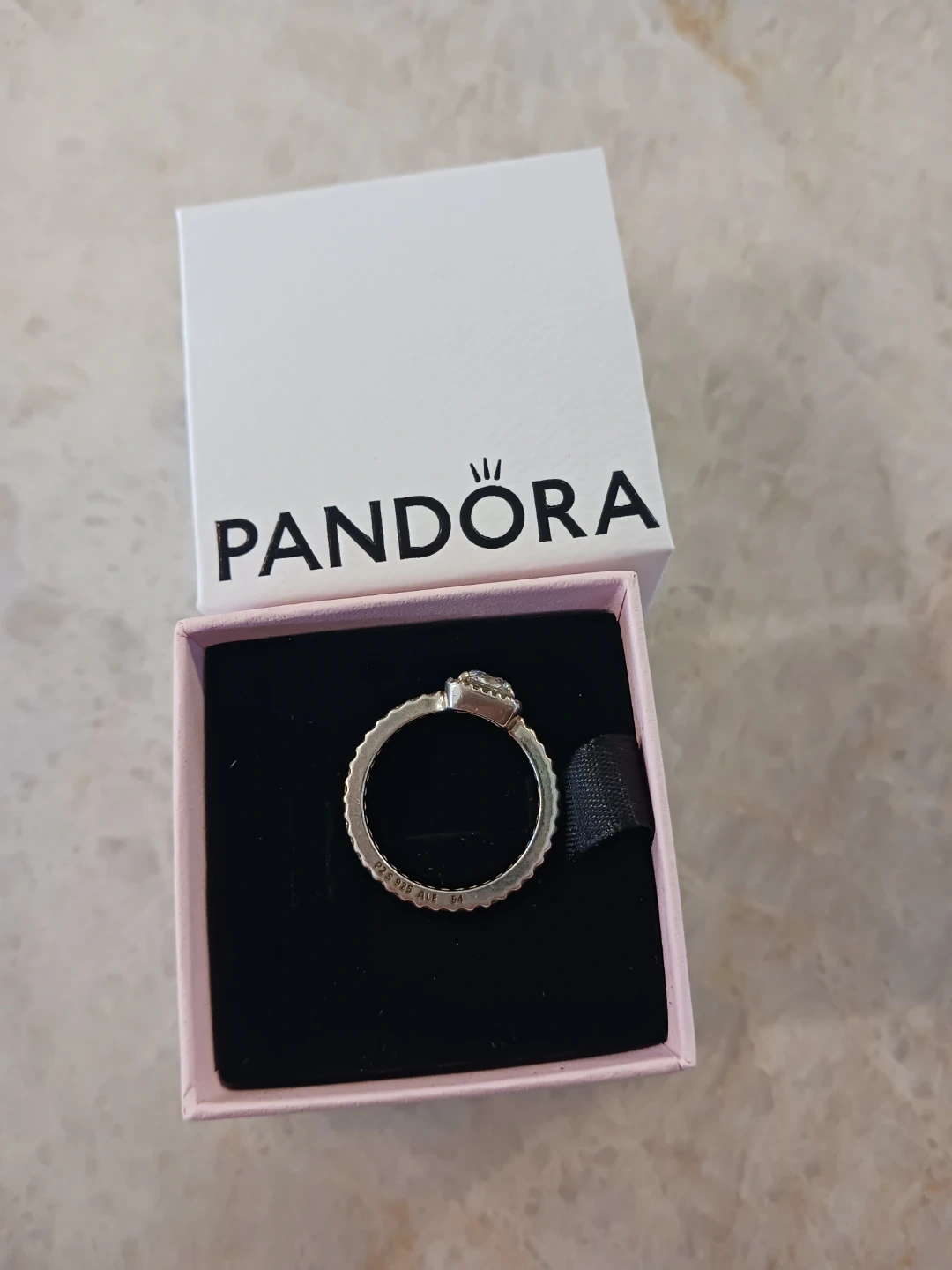 I'm selling a pandora ring features a prominent cushion-cut stone. It's stamped with 'S925 ALE 54'. Includes the original Pandora box.