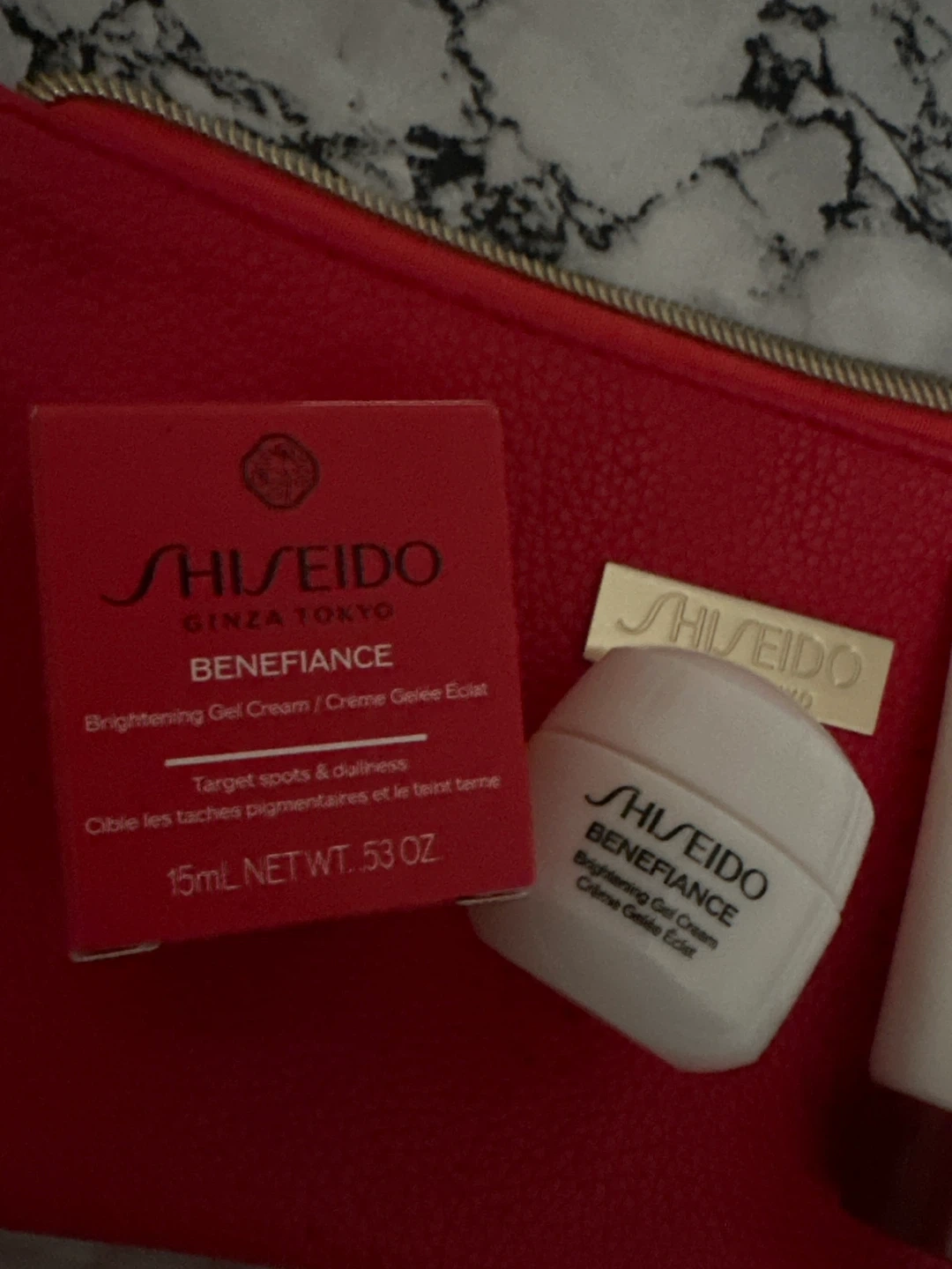This Shiseido set includes the Benefiance Brightening Gel Cream and Clarifying Cleansing Foam. The gel cream targets spots and dullness, and it's 15mL net wt. 53 oz. The cleansing foam is for all skin types.