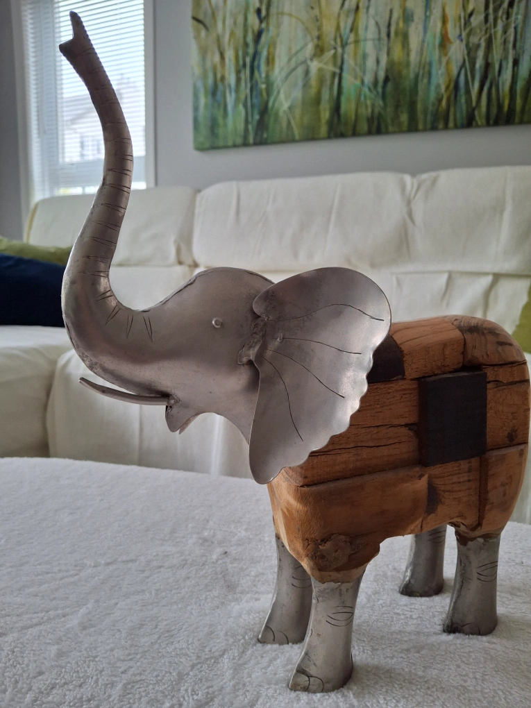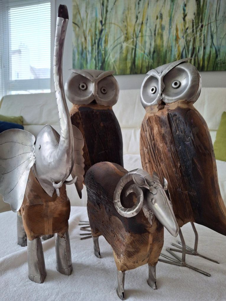 FREE! Unique animal decorations made from treated wood & metal, includes two matching owls, an elephant & a ram. The owls stand 15" high.