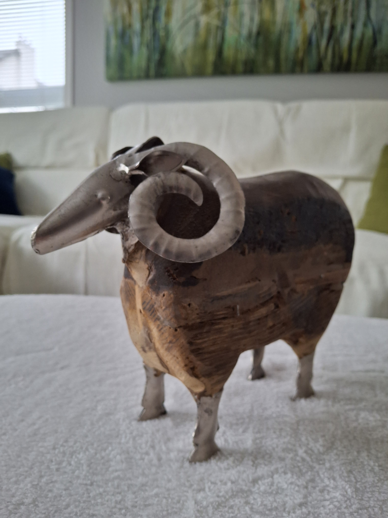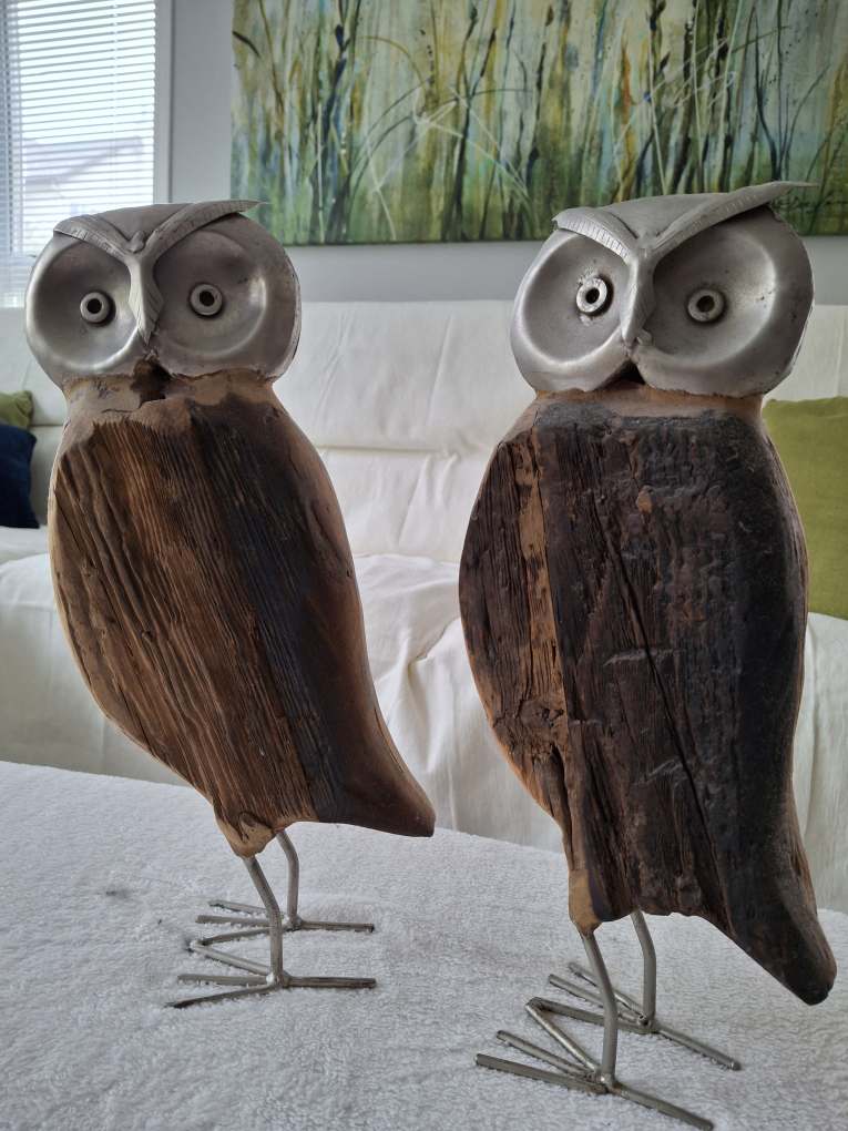 FREE! Unique animal decorations made from treated wood & metal, includes two matching owls, an elephant & a ram. The owls stand 15" high.