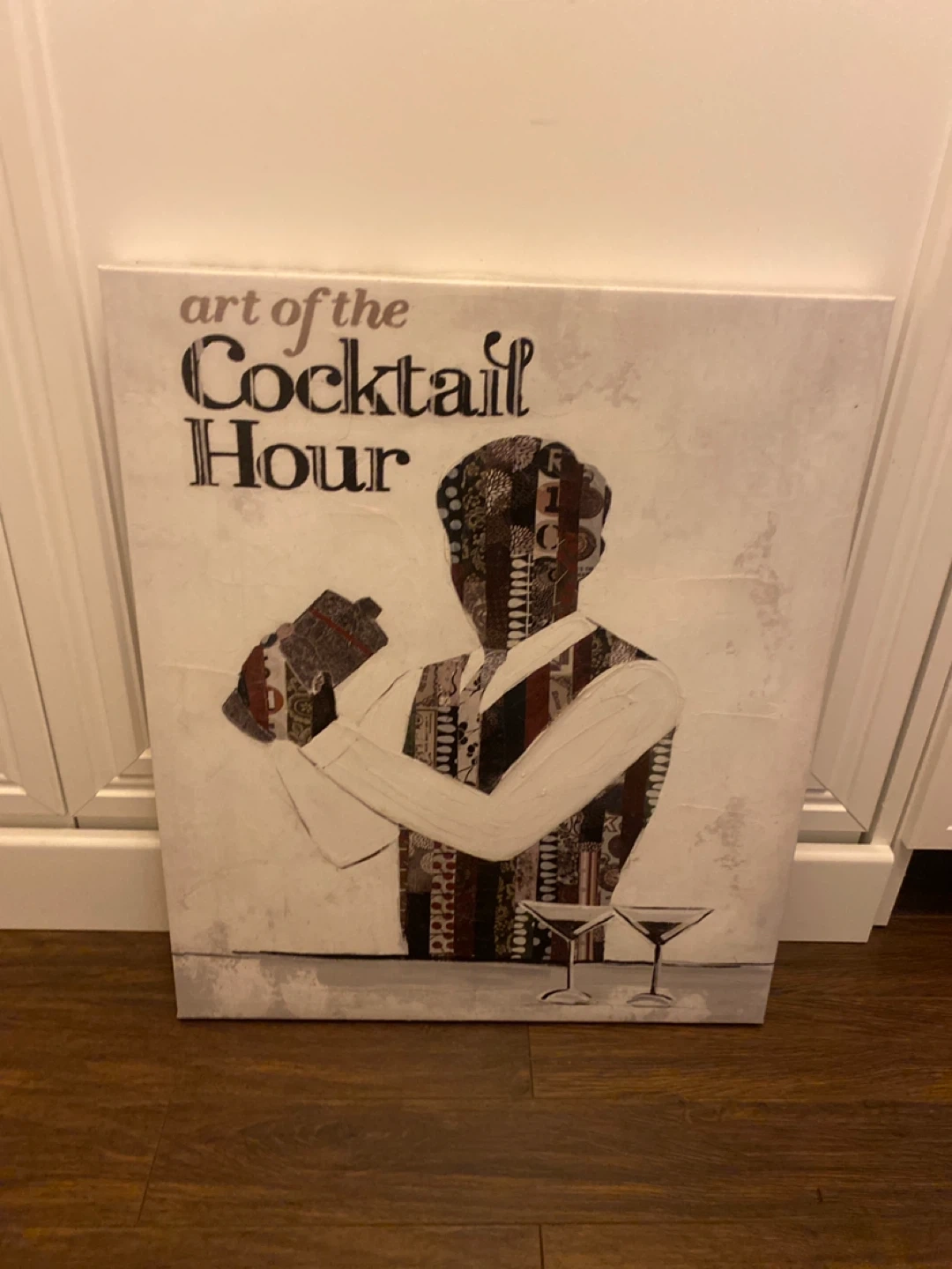 This canvas wall art features a stylish graphic of a bartender preparing drinks. It's titled "Art of the Cocktail Hour." A great piece for a home bar or kitchen!