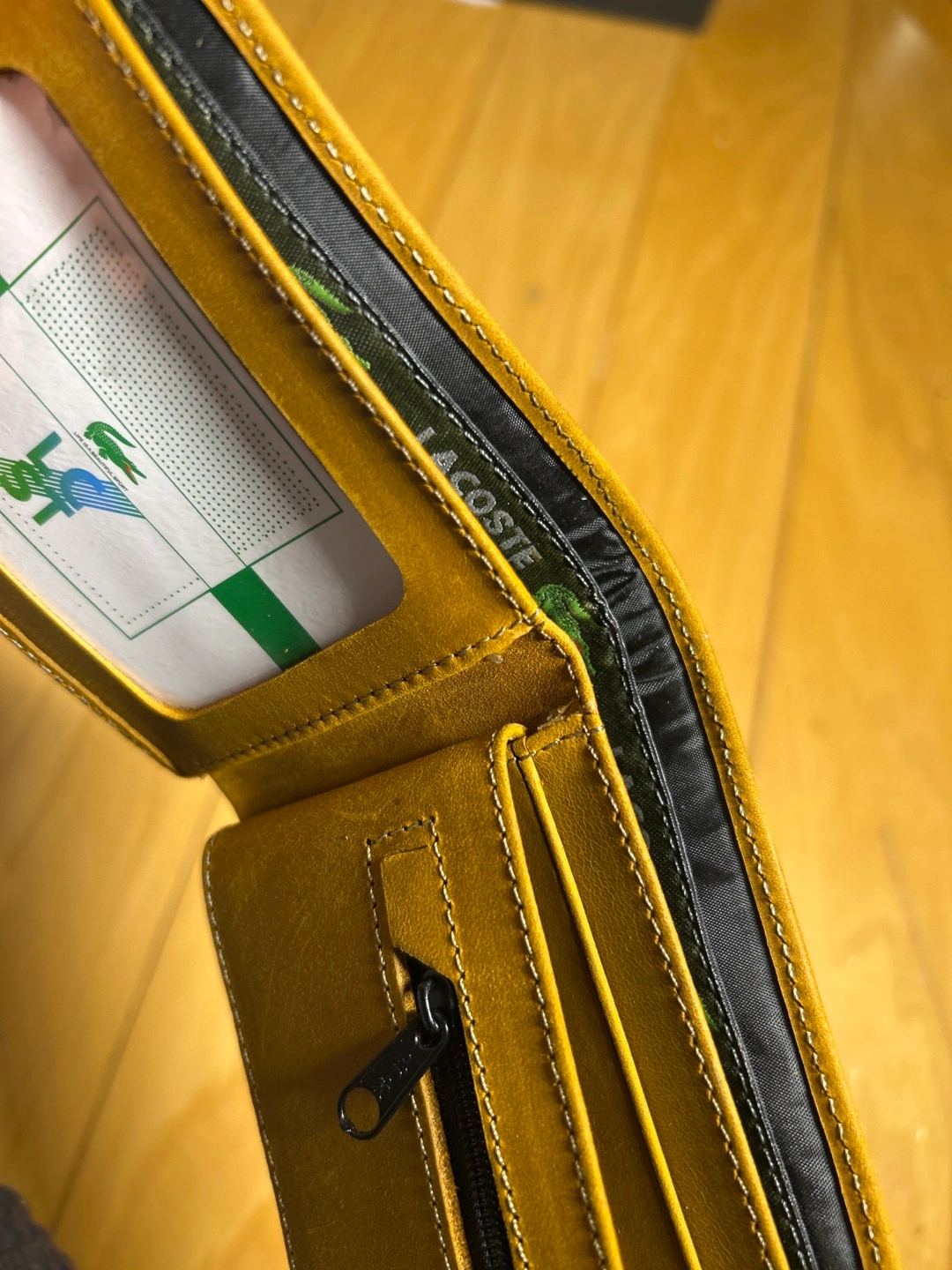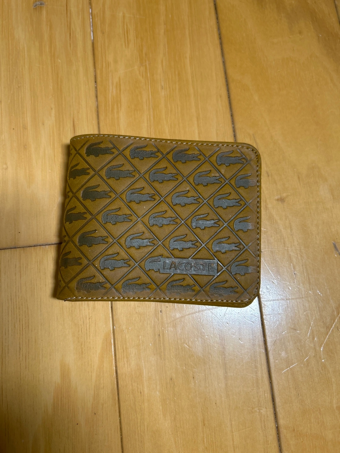 Brown Real leather wallet with Lacoste crocodile pattern. Features multiple card slots, a billfold, and a zippered compartment.