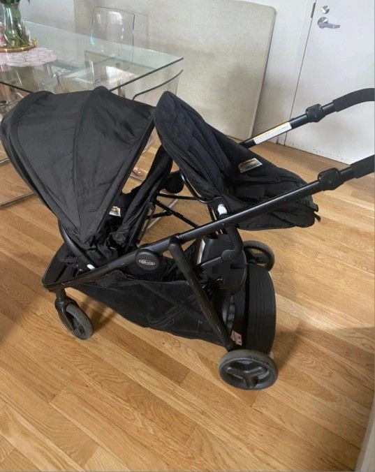 This stroller rides like a double stroller but folds like a single. It includes 2 seats, a bench seat, and a standing platform. It is also compatible with all Graco infant car seats. Features: Adjustable back rest, Basket, Folding, Hood/Canopy, Lockable swivel wheels. Color: Black. Brand: Graco. Seating Capacity: Double.