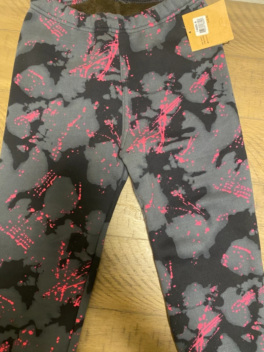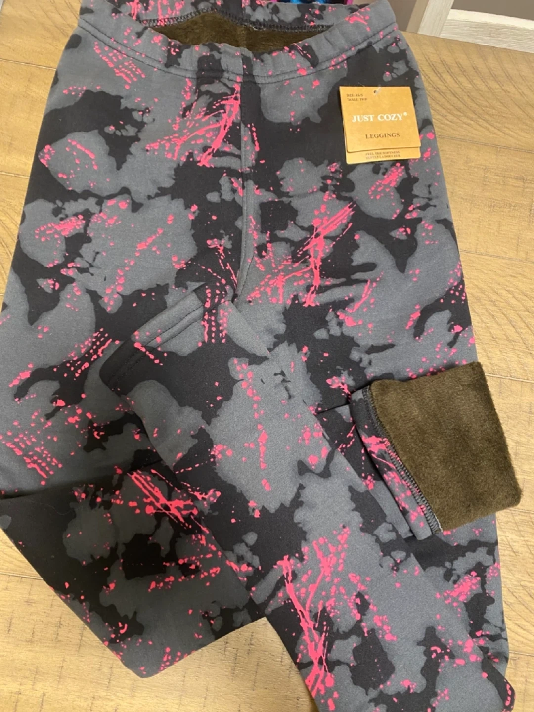 These Just Cozy leggings feature a fun grey and pink splatter print. They're fleece-lined for extra warmth and softness. The size is xs/s