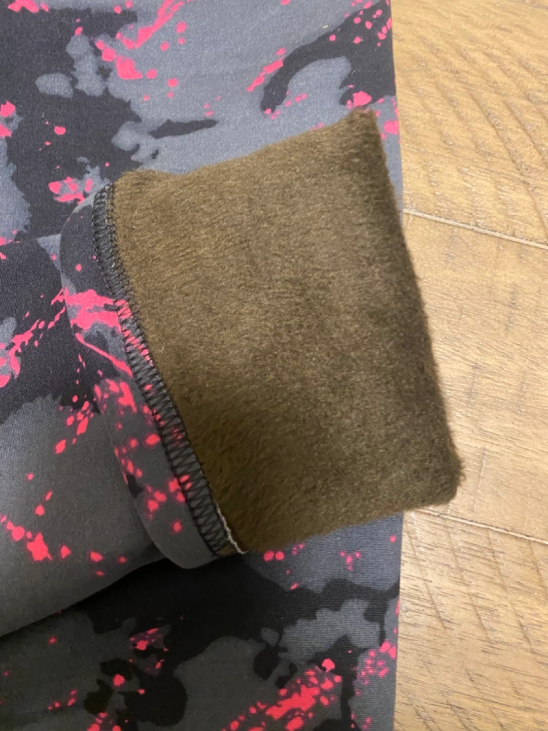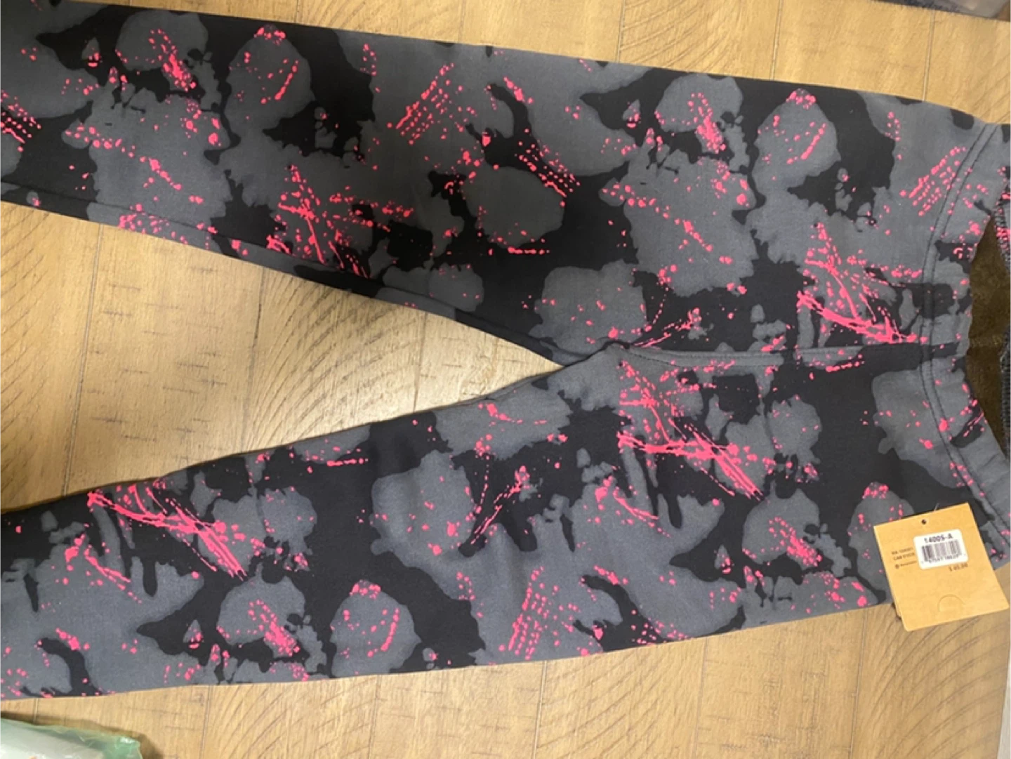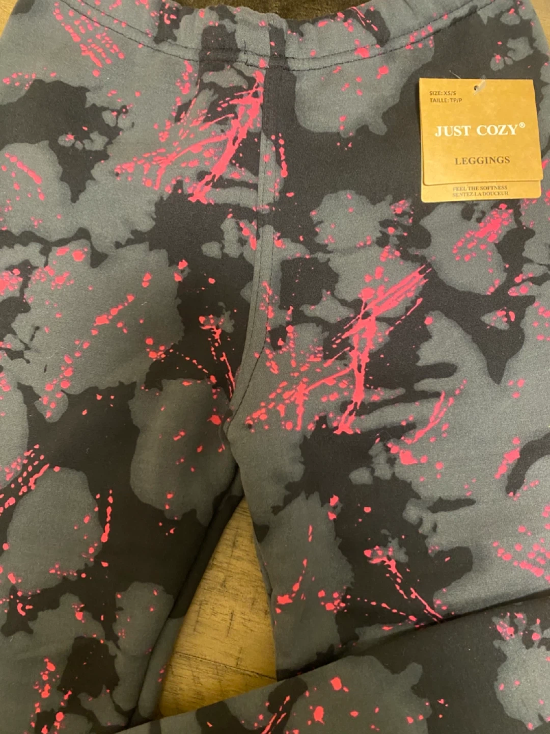 These Just Cozy leggings feature a fun grey and pink splatter print. They're fleece-lined for extra warmth and softness. The size is xs/s
