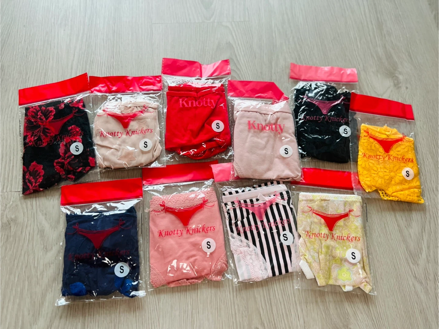 A 10-pack of Knotty Knickers assorted underwear in size S. This collection includes a variety of colours and styles, some featuring lace details and button accents. They're individually packaged.