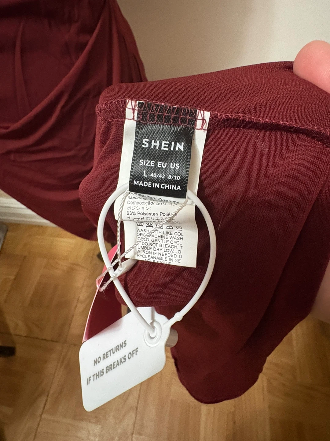 This SHEIN maxi dress features a stylish one-shoulder design with elegant ruching. It's made from 93% polyester and 7% elastane for a comfortable fit. The dress comes in a rich burgundy color and is a size L (US size 8/10).