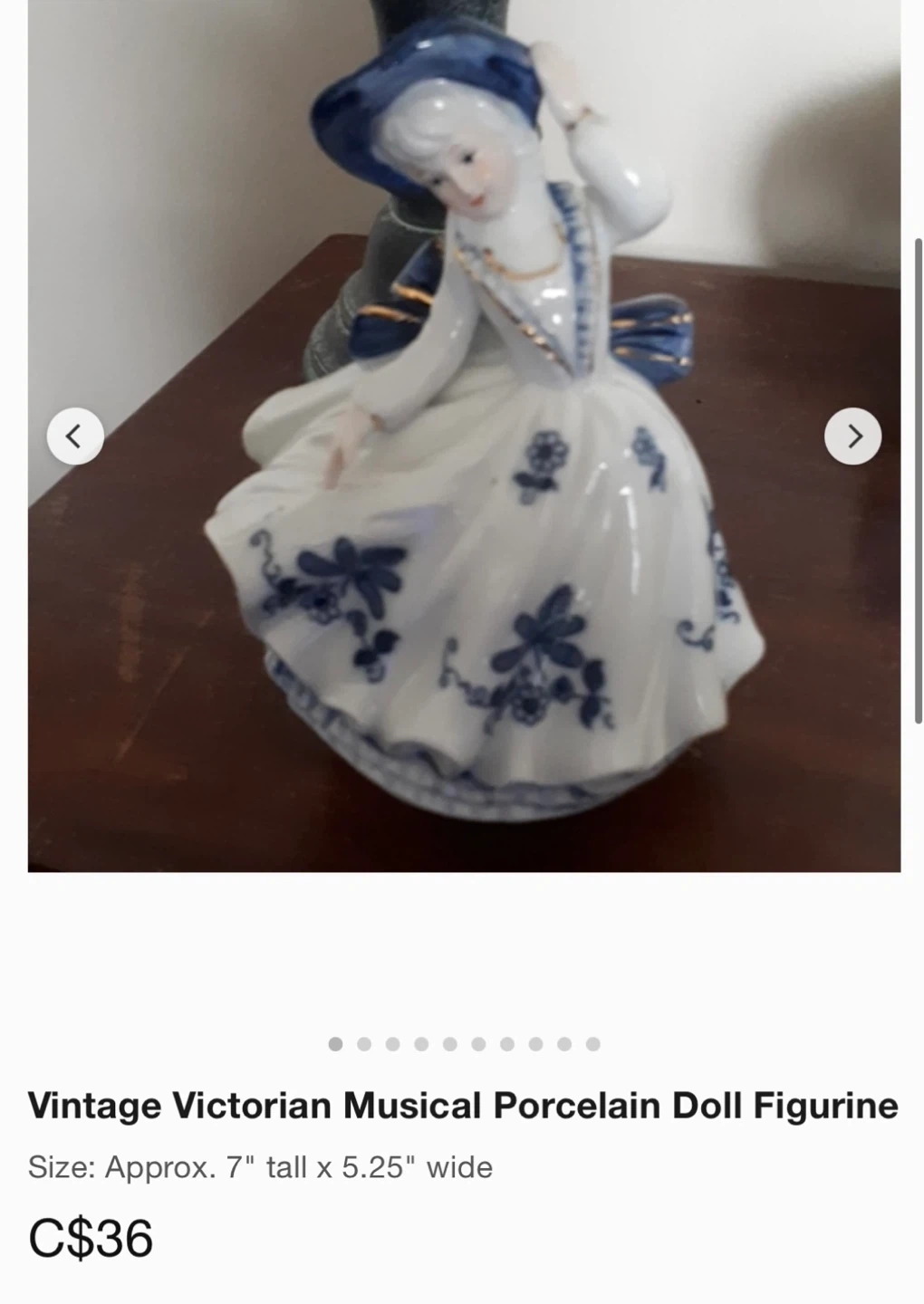 $30 Vintage Victorian Cobalt Blue and White musical porcelain doll figurine.