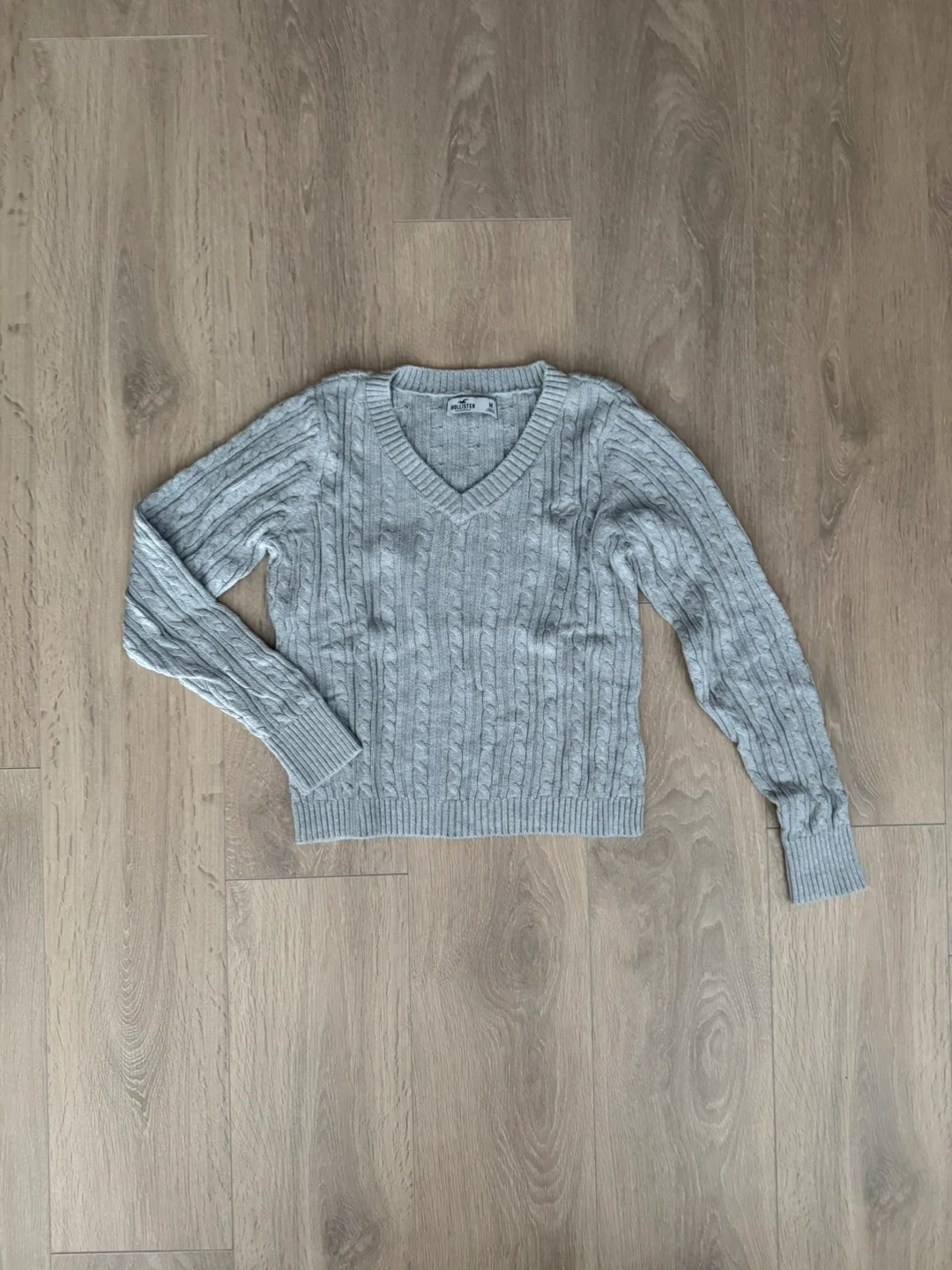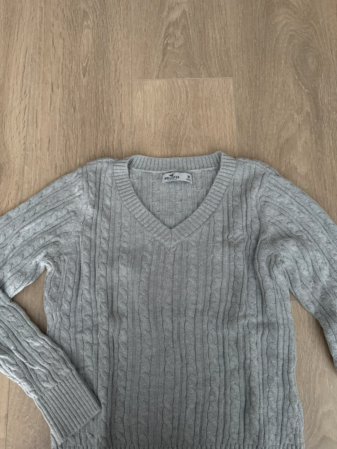 Cozy grey cable knit sweater from Hollister. It's a size medium with a classic V-neck design. Looks great layered or on its own for a casual vibe! Only worn a few times, Im selling since Im a student! I do discounts on bundles!!