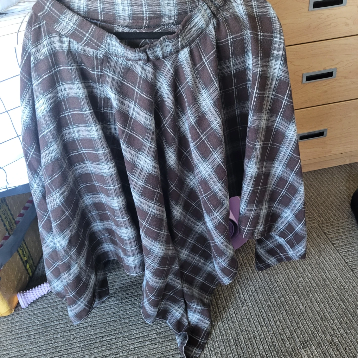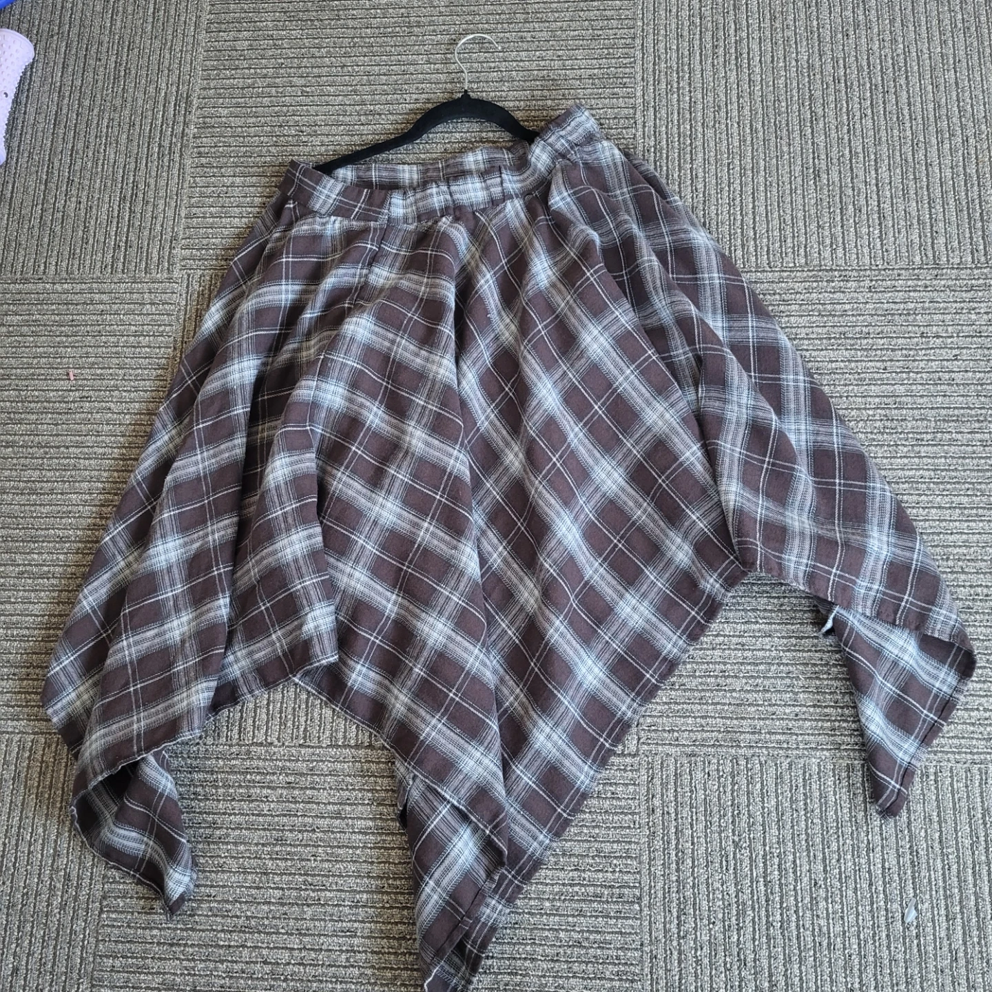 This asymmetrical skirt features a brown and white plaid pattern. It's made from a lightweight fabric for a comfortable fit. The unique hemline adds a stylish touch to any outfit. Size L.