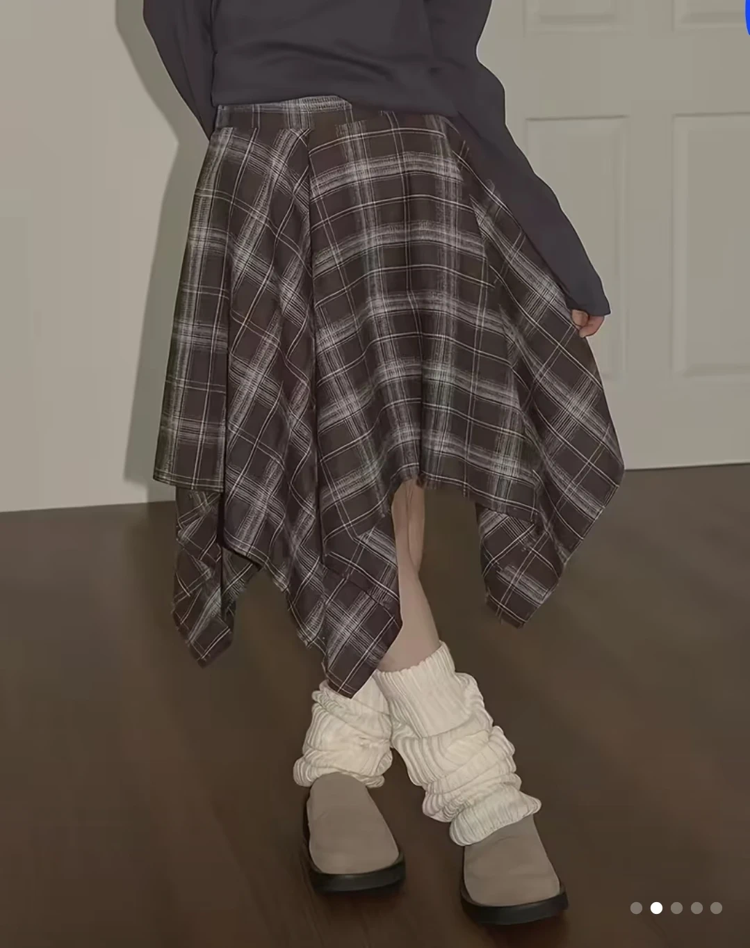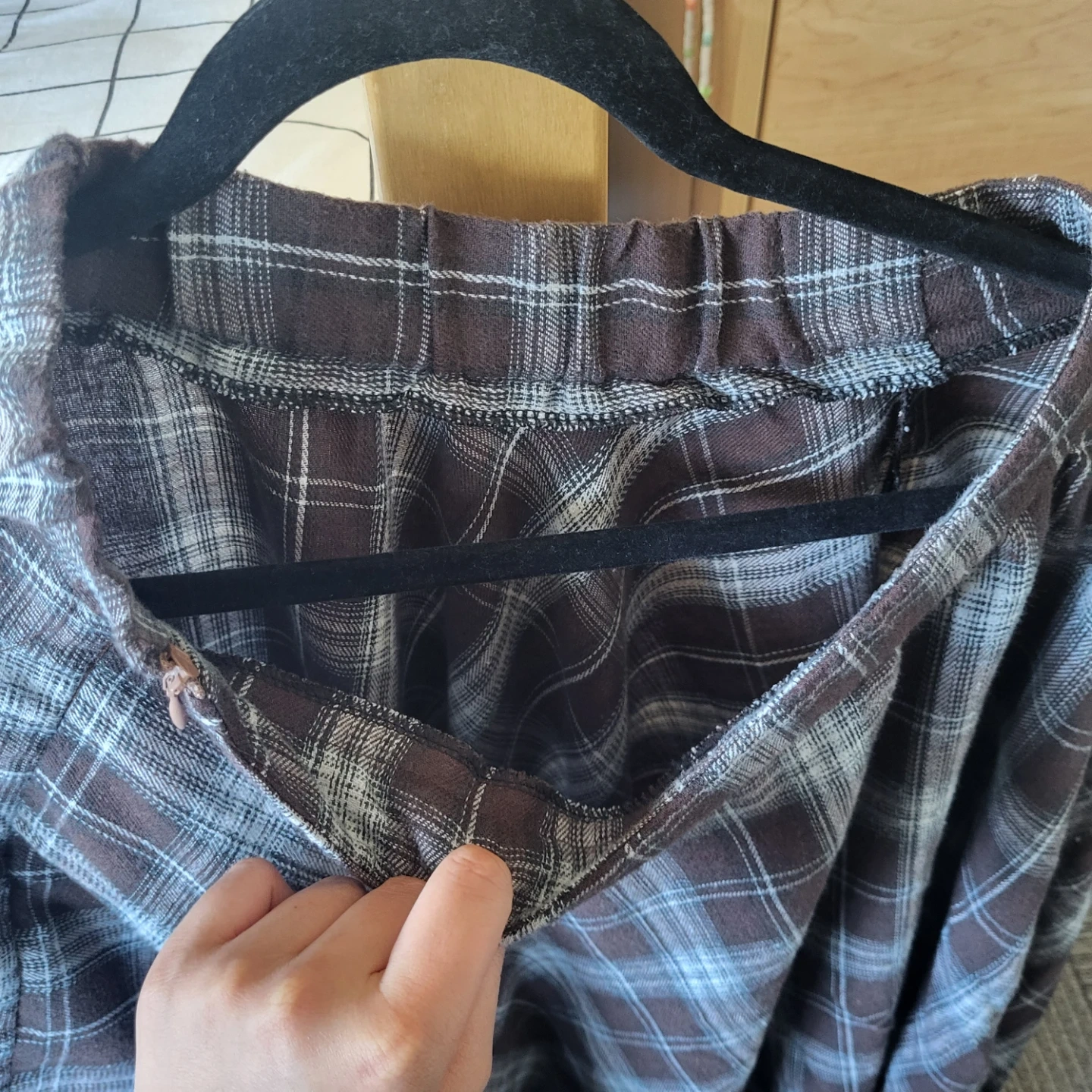 This asymmetrical skirt features a brown and white plaid pattern. It's made from a lightweight fabric for a comfortable fit. The unique hemline adds a stylish touch to any outfit. Size L.
