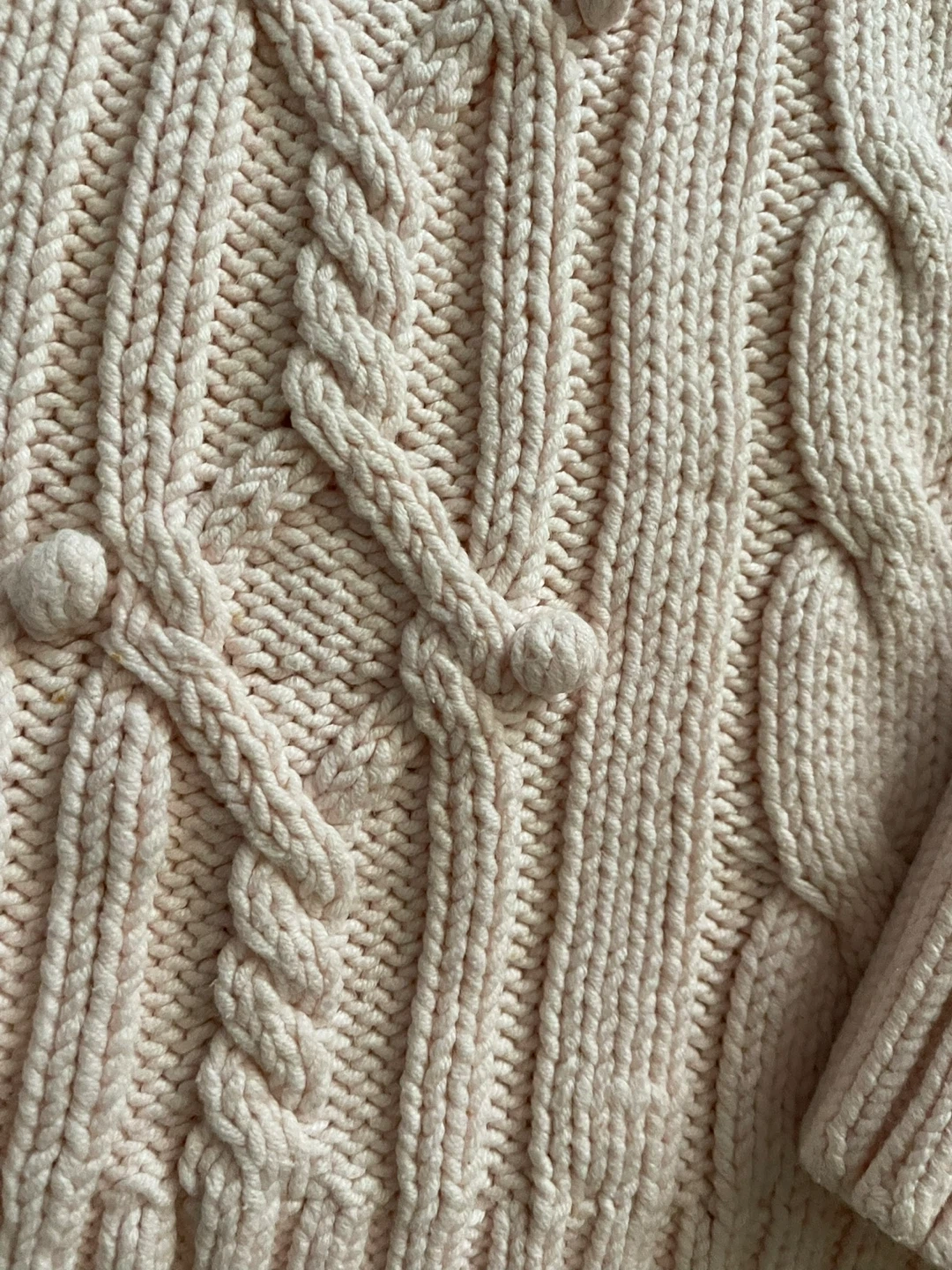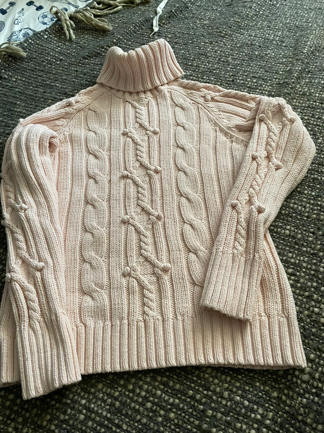 š„IZOD pink cable knit turtleneck sweater. Features a detailed cable knit pattern with bobbles. Made from a cotton and acrylic blend. Size medium.