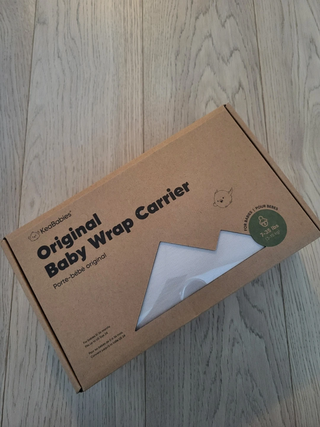 KeaBabies Original Baby Wrap Carrier in a soft grey colour. This wrap is suitable for babies from birth up to 36 months and for weights between 7-35 lbs. It's made from a comfortable, stretchy fabric to keep your little one snug. This carrier is great for keeping your baby close while you're on the go!
