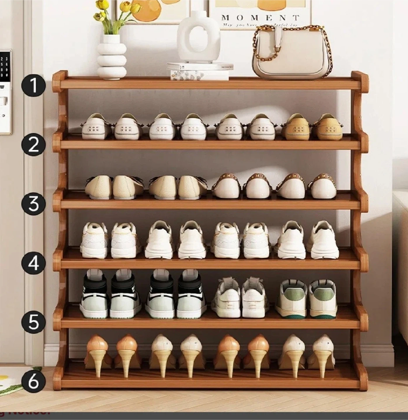 Organize your footwear with this brand-new, in-box, 6-layer space-saving bamboo shoe rack. Perfect for entryways, closets, or anywhere you need extra storage, this rack combines functionality with a touch of natural elegance. Easy to assemble and designed to maximize space, it's an ideal solution for keeping your shoes neatly arranged.