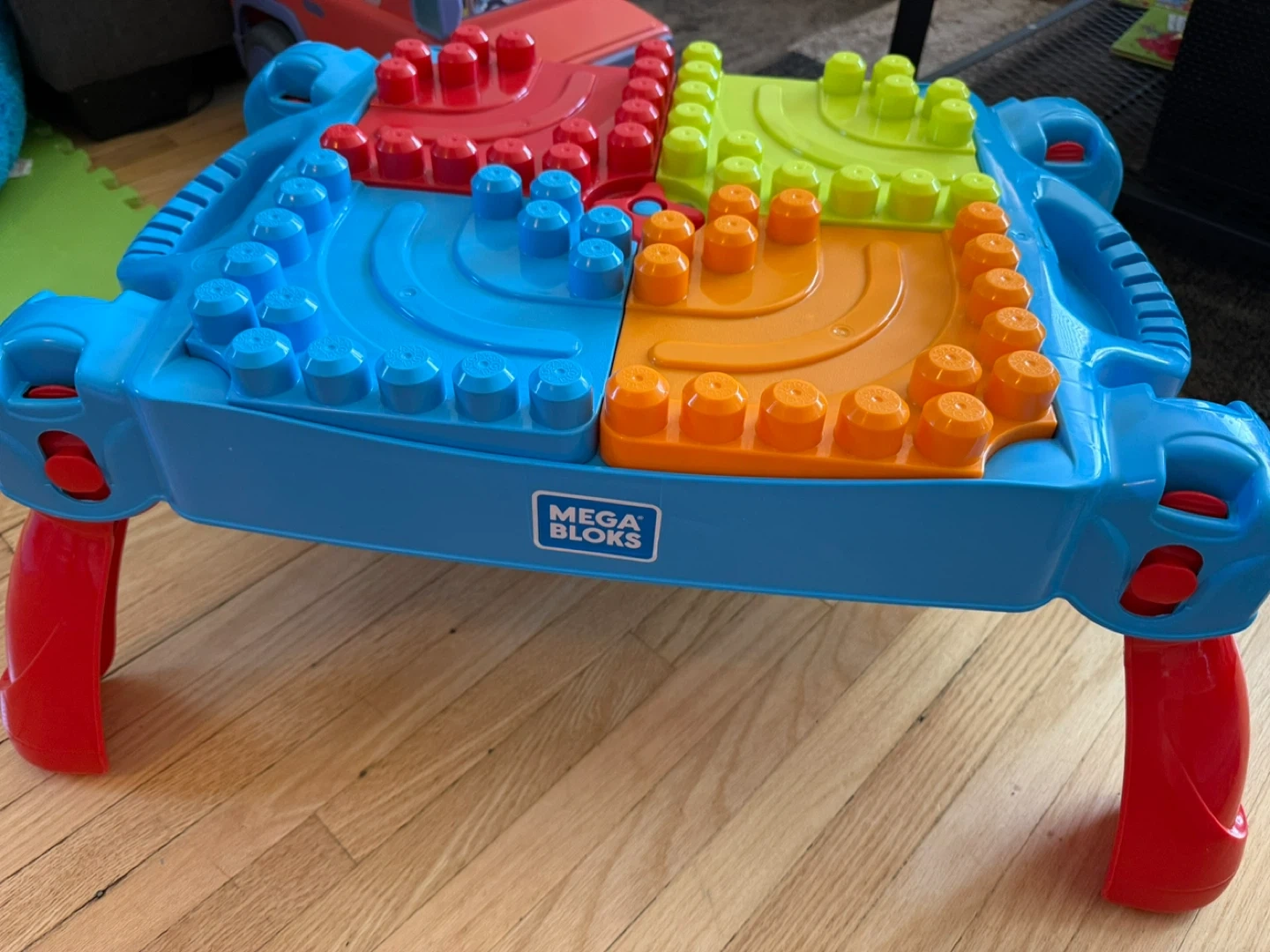 This is a blue Mega Bloks activity table with red, blue, orange, and green building surfaces. It has red legs. Perfect for little builders!