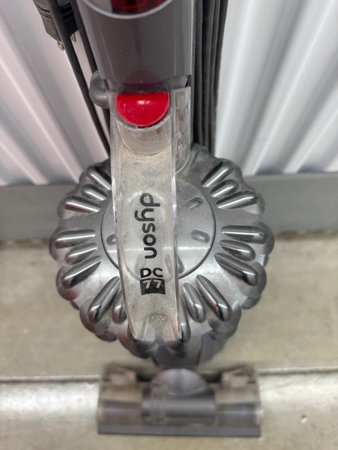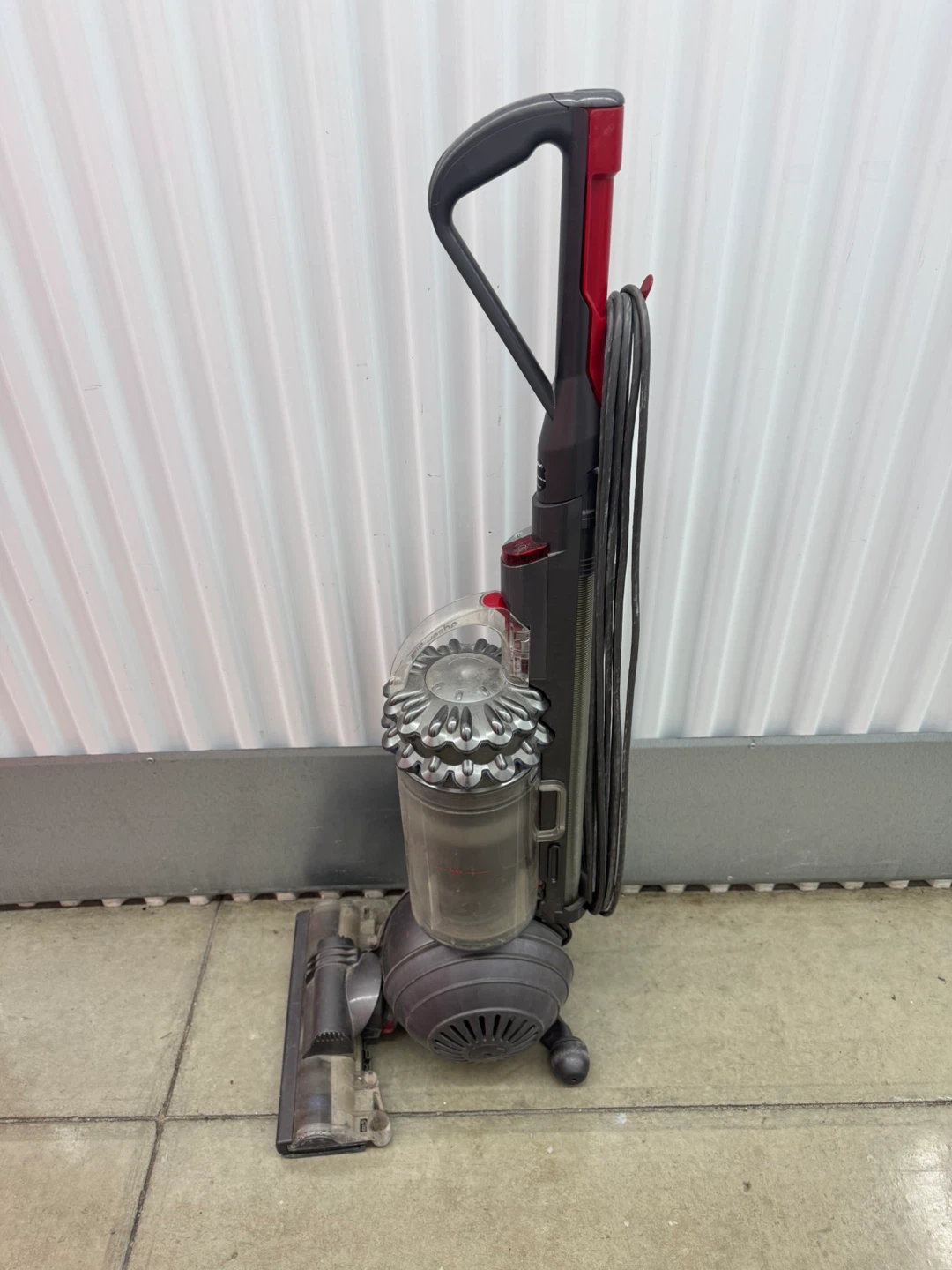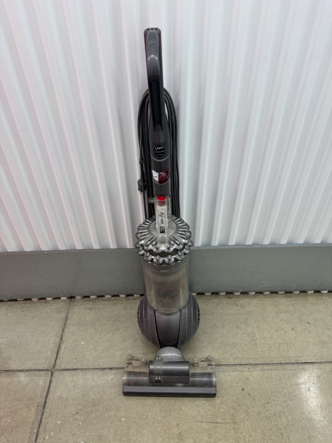 This is a Dyson DC77 upright vacuum cleaner. It's a grey and red model with a corded design. The machine has a clear dustbin and comes with the floor head attachment. All the accessories and attachments will also be included.