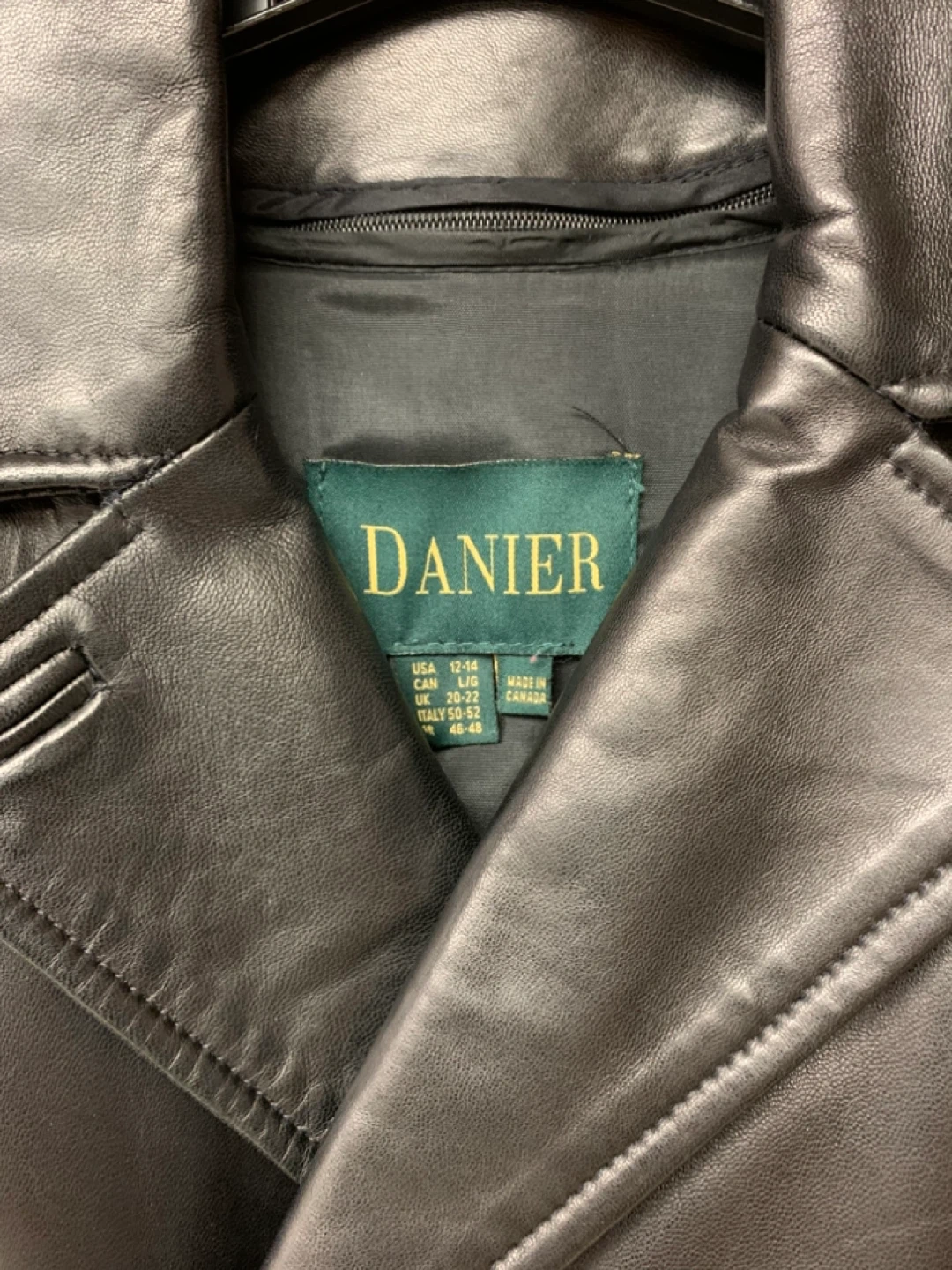 Classic black leather double-breasted jacket by Danier. Features a notched lapel and button closure. Made in Canada. Size L.