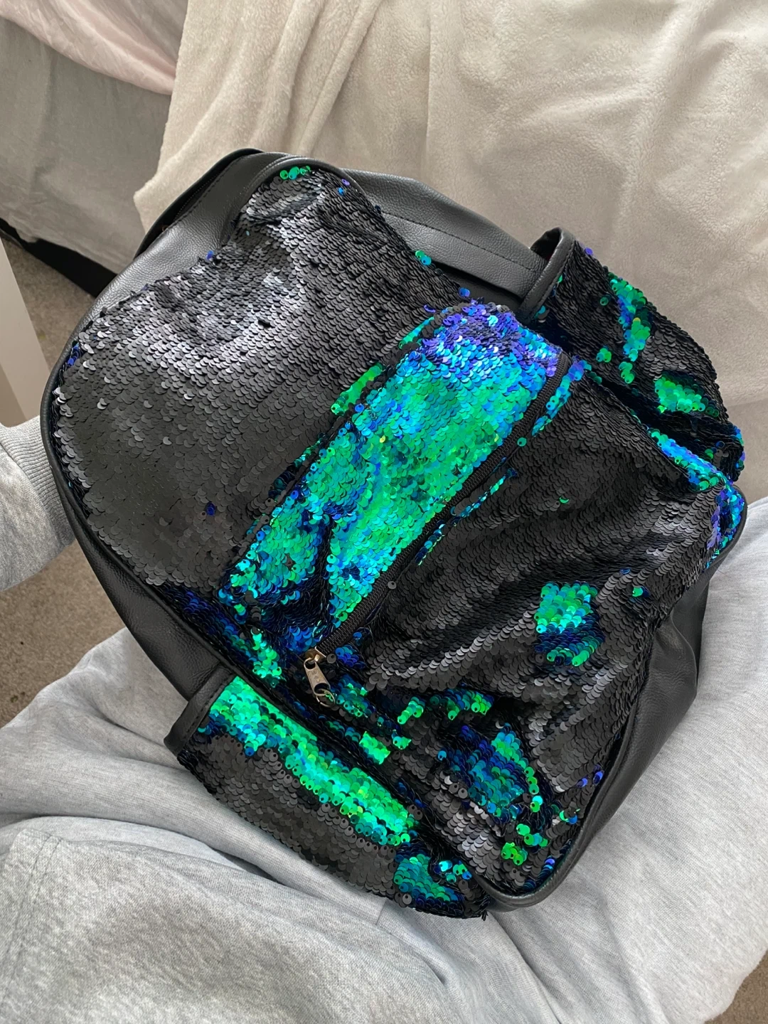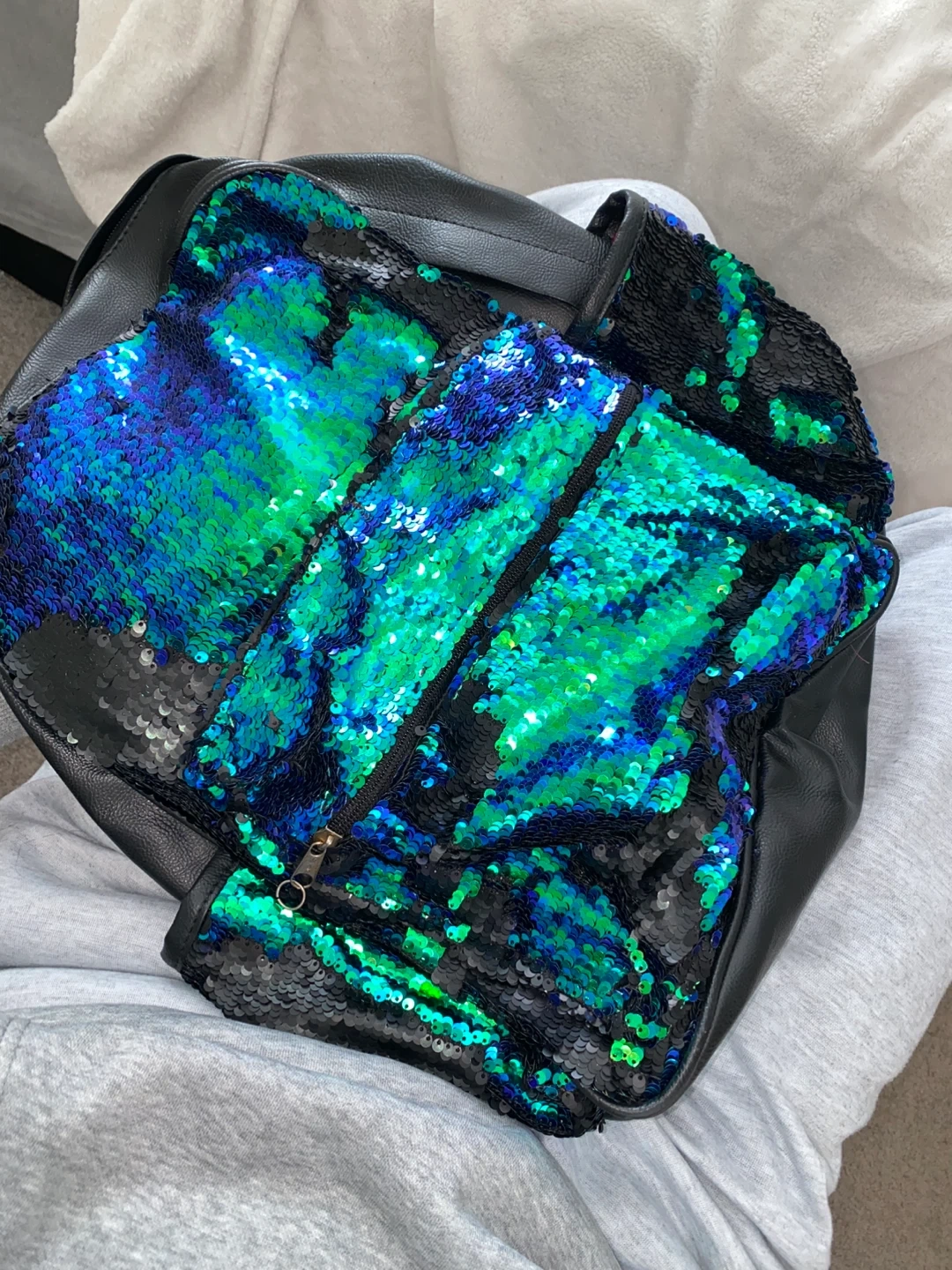 This black backpack is adorned with dazzling reversible sequins that shift from green and blue to black. It's a stylish accessory with a zippered front pocket and main compartment. Perfect for adding a pop of colour and fun to your everyday carry!