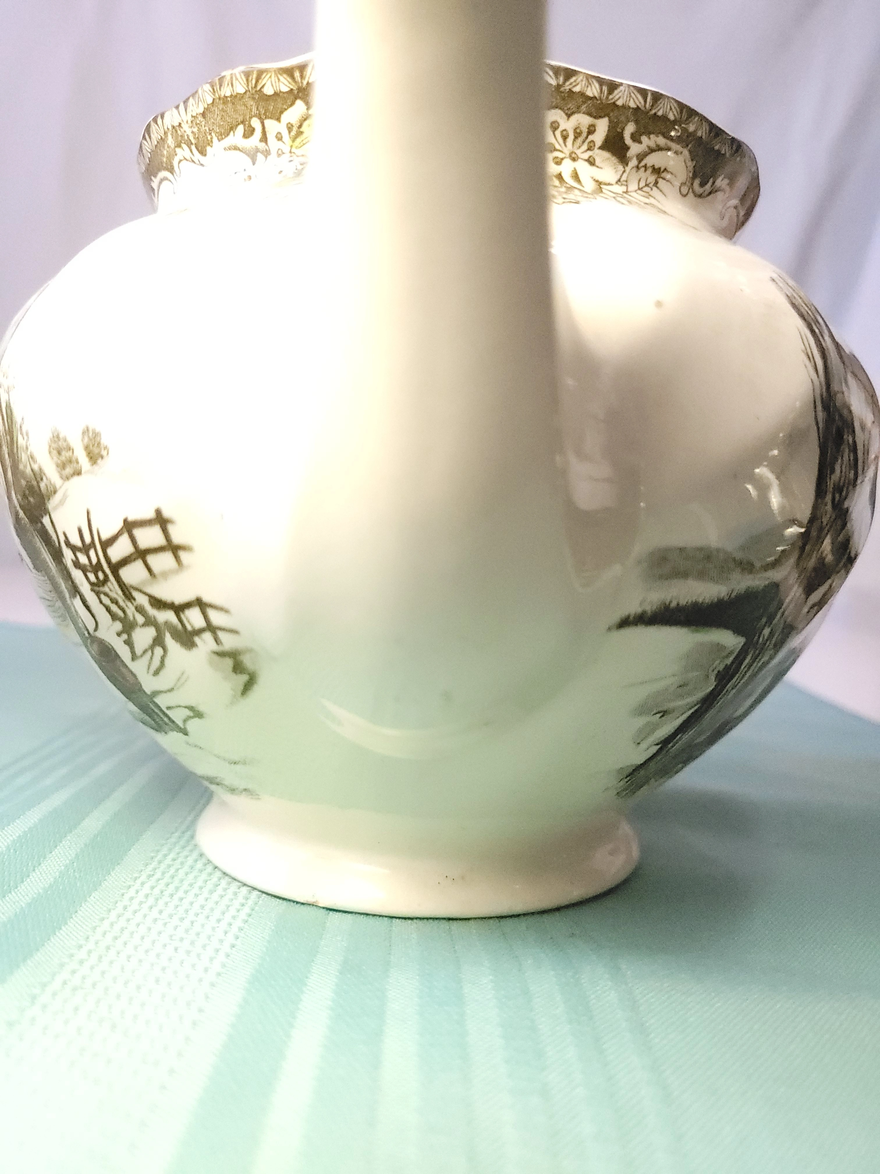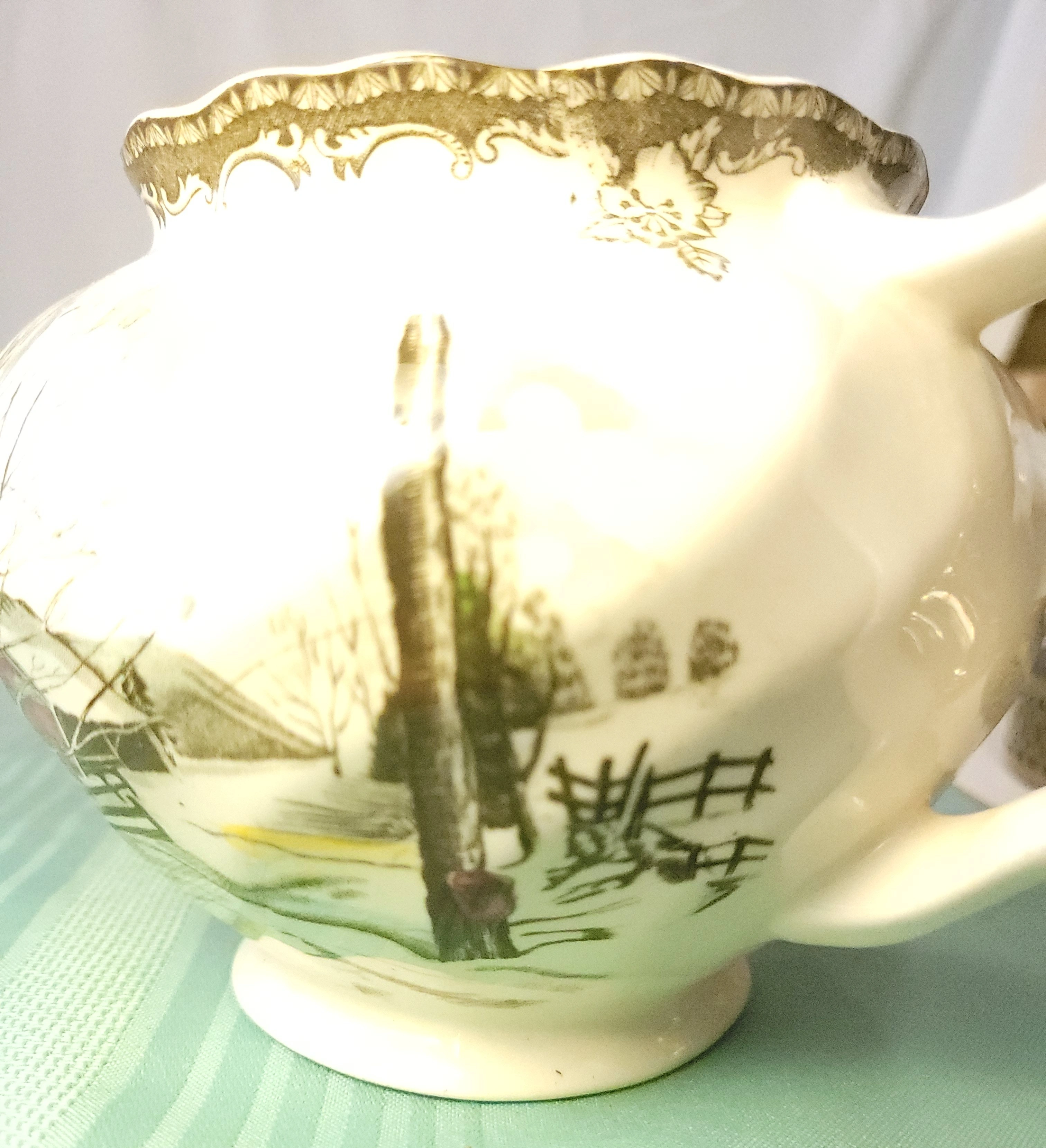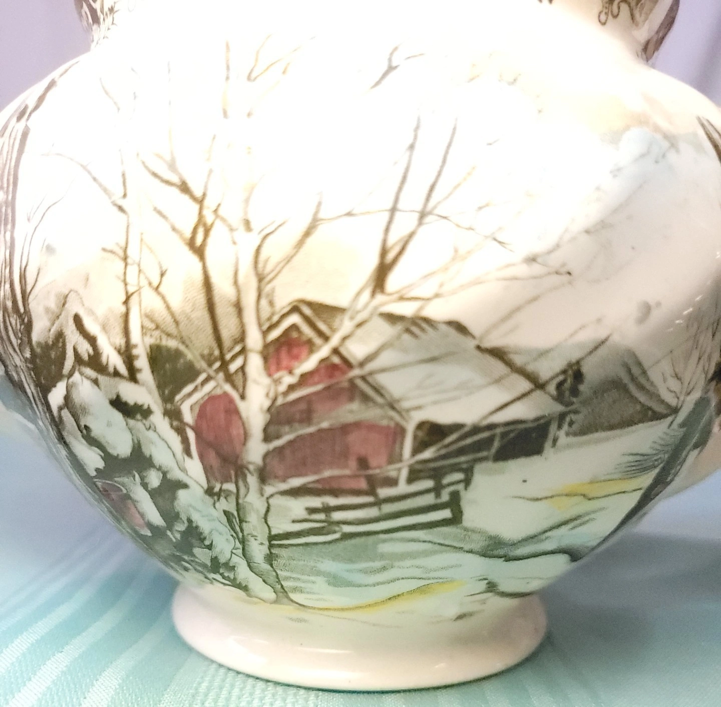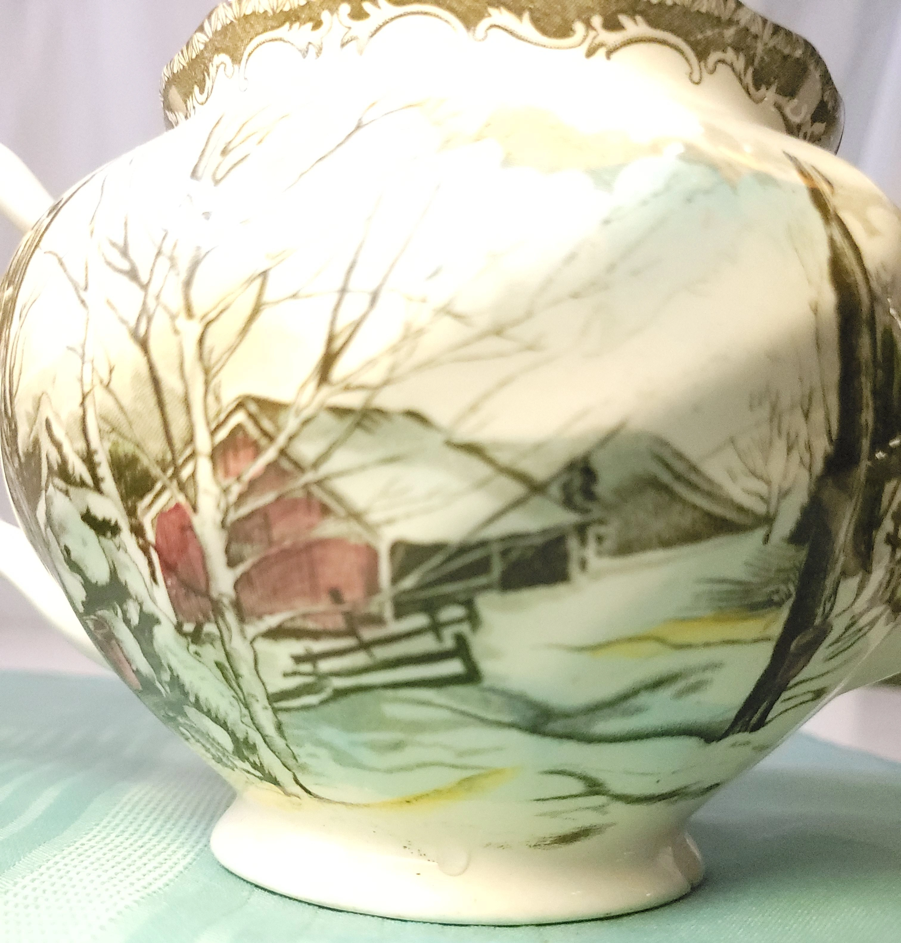 This is an authentic vintage teapot from Johnson Brothers in the iconic The Friendly Village pattern. This piece features the "Sugar Maples" scene, which is the quintessential winter design of the collection. This is an original English-made piece, featuring the classic mailbox backstamp used shortly after the pattern's debut in 1953.