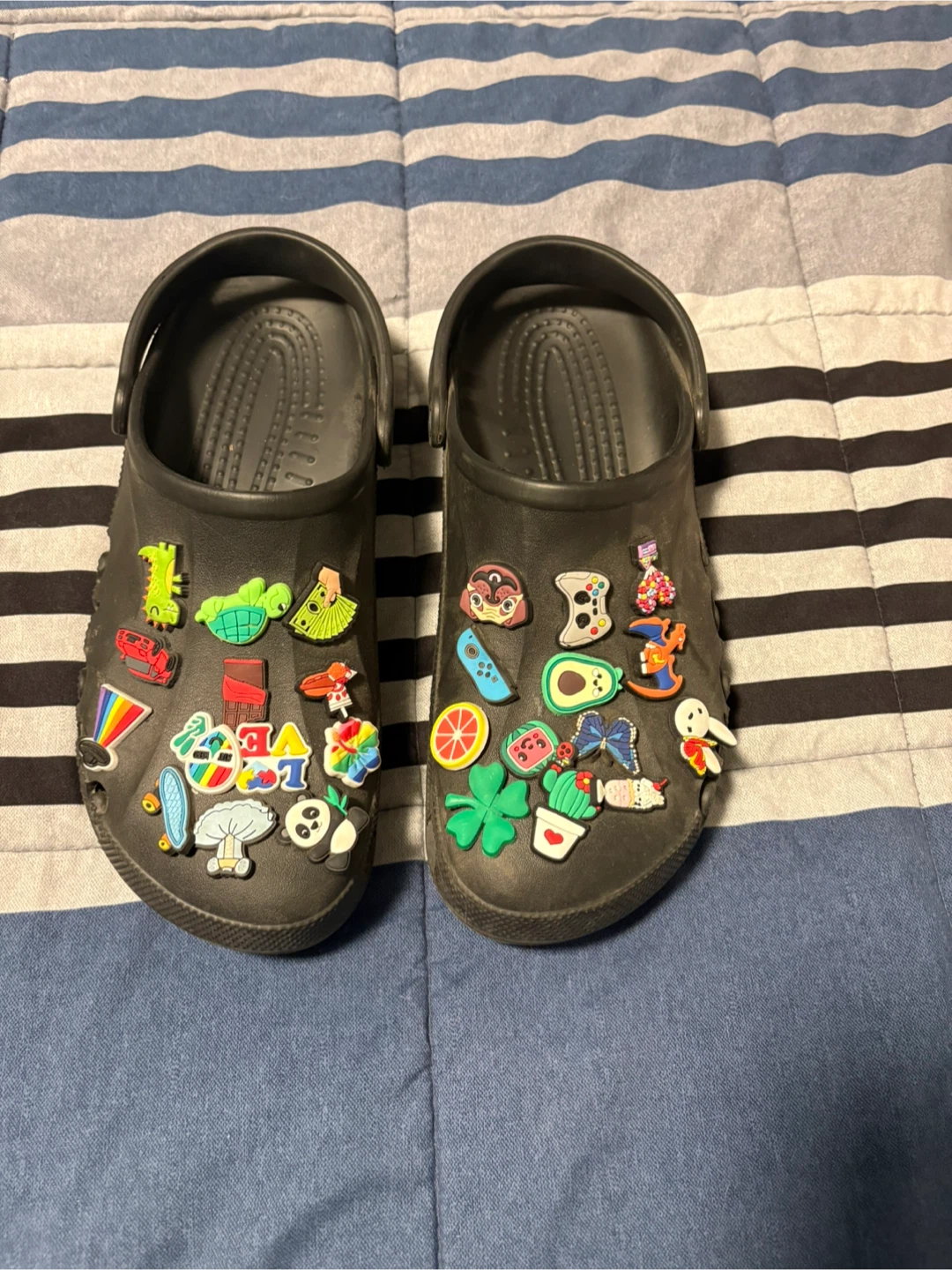 1 / 31 / 3Buy & SellBlack Crocs Size 11 with CharmsBlack Crocs Size 11 with Charms$14These are black Crocs in size 11, decorated with a variety of fun Jibbitz charms. They're made in Mexico. Perfect for casual wear!ConditionGoodSize11BrandCrocsWHERE TO MEETCheck LocationView MapSELLERverifiedClaytonOttewell1356 reviews1 chats·1 favorites·56 viewsSEND CHAT TO SELLERHi Clayton! I’m interested in your listing.Hi Clayton! I’m interested in your listing.Get the Karrot app to chatSign In to chat