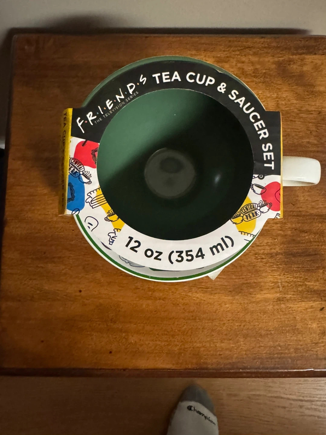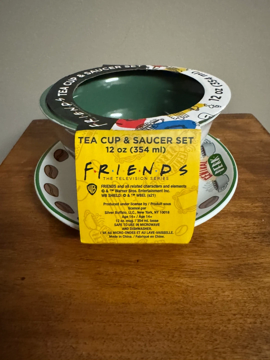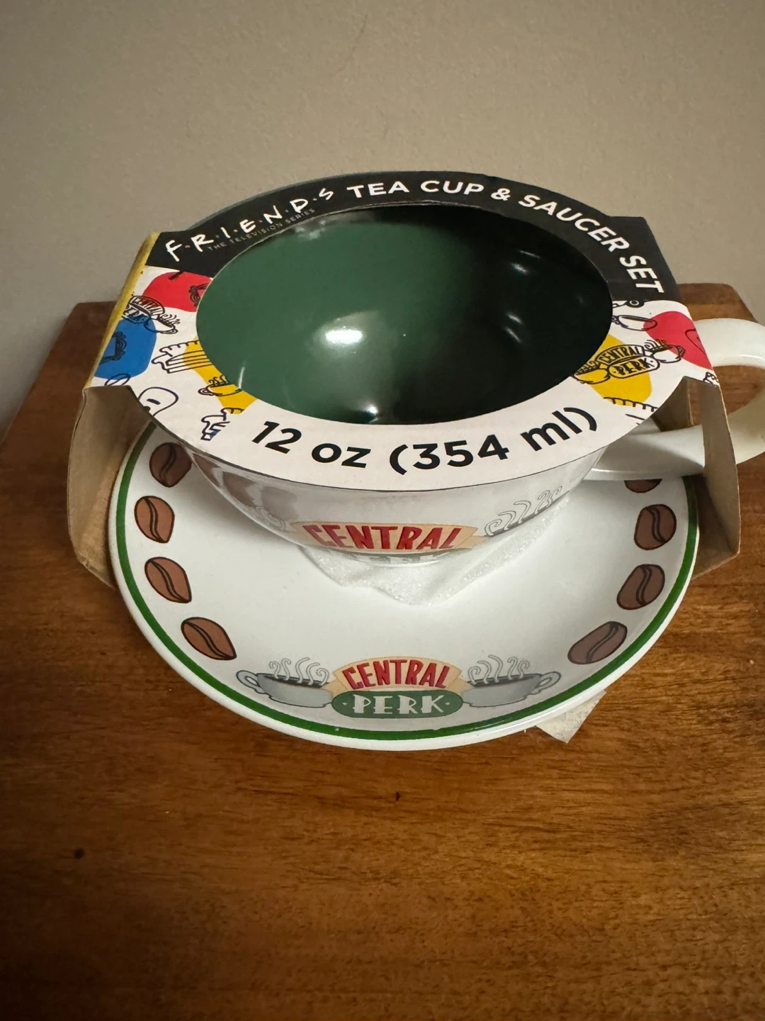 This FRIENDS tea cup and saucer set features the iconic Central Perk logo. It holds 12 oz (354 ml) and is made for enjoyment of your favourite hot beverage. The set is dishwasher safe.