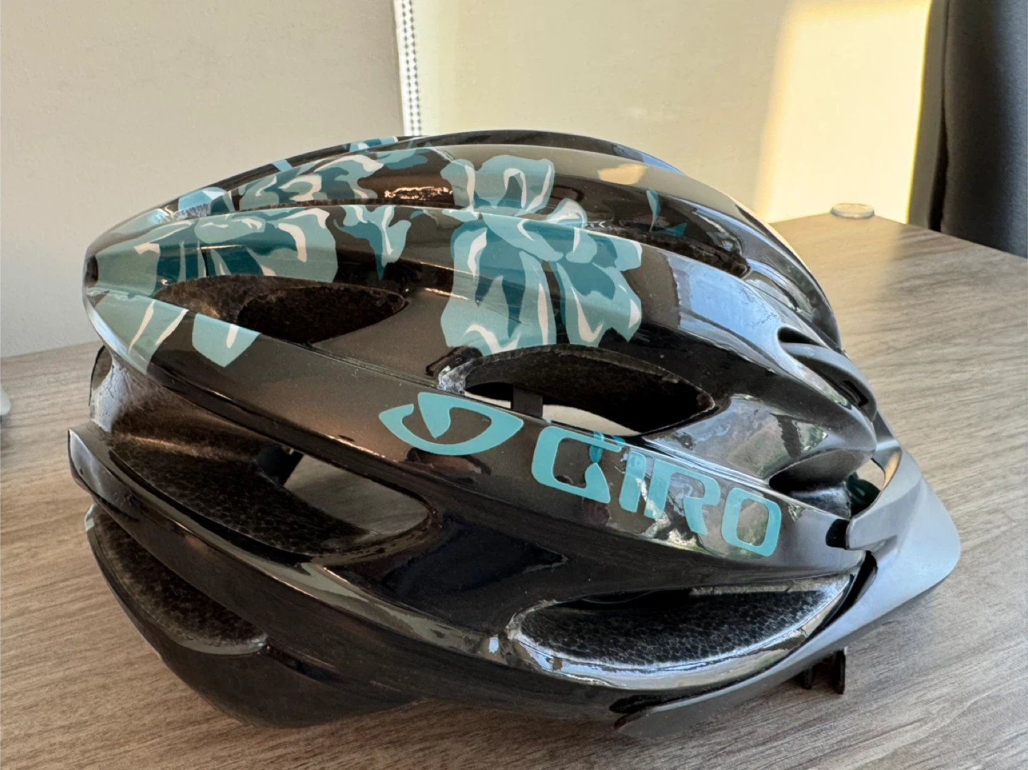 Black Giro cycling helmet with a blue floral pattern. It's designed for ventilation and features adjustable straps. The shell is hard plastic and the interior has padding.